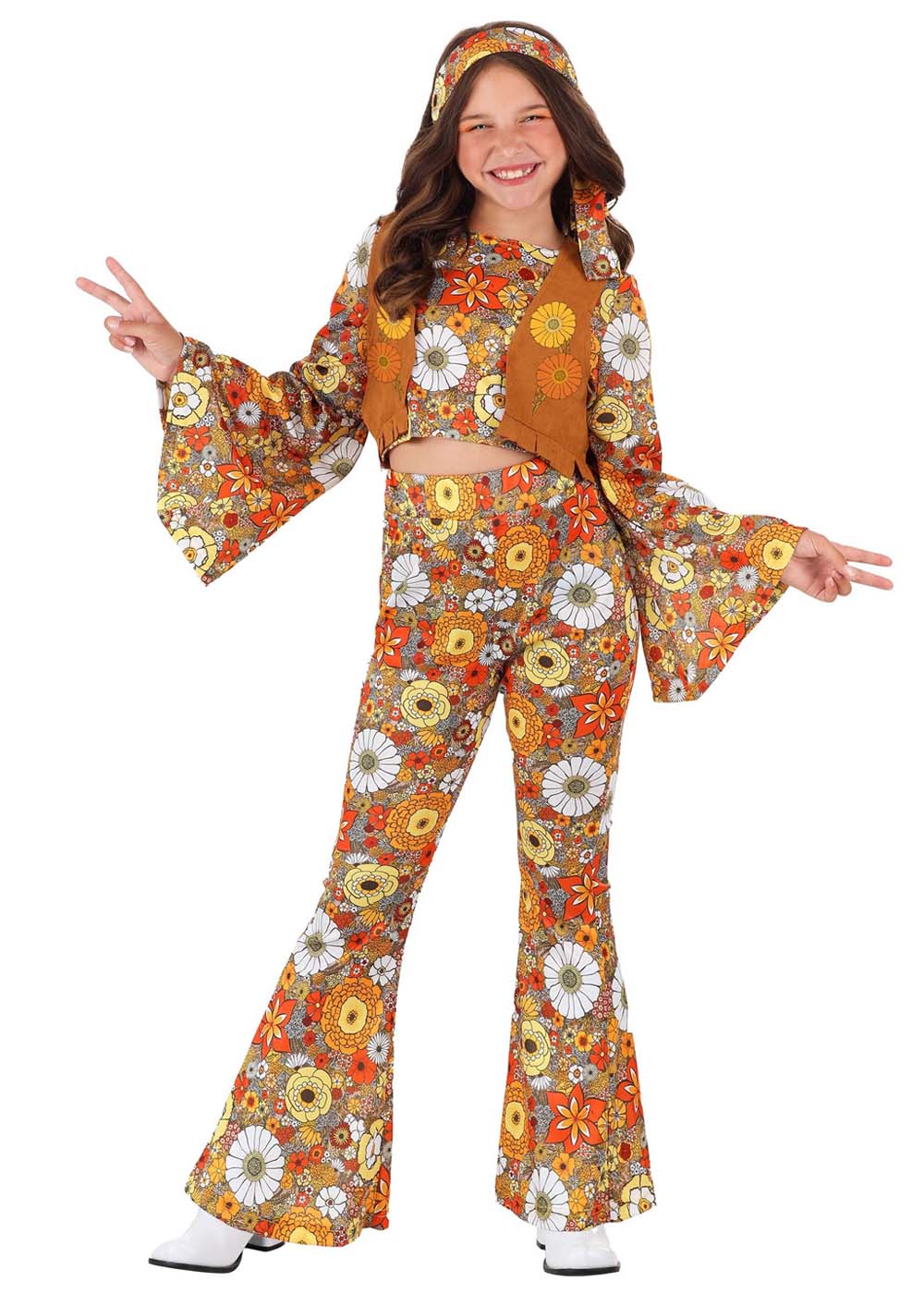 Дух свободы и красоты осеннего цветка в этом потрясающем костюме хиппи! Кофта с открытым животом и расклешенными рукавами добавит образу легкости и непринужденности. Широкие брюки с расклешенными штанинами имеют широкий эластичный пояс для удобной посадки. Жилет из искусственной замши с бахромой по нижнему краю и нанесенными цветами придаст образу дополнительную яркость. Ободок для волос из того же материала, что и рубашка и брюки, позволяет вам подобрать его по вашему желанию. Золотистое металлическое ожерелье с подвеской в виде треугольника внутри круга дополнит ваш образ стилем и изысканностью. Погрузитесь в атмосферу гармонии и свободы хиппи с этим великолепным костюмом!