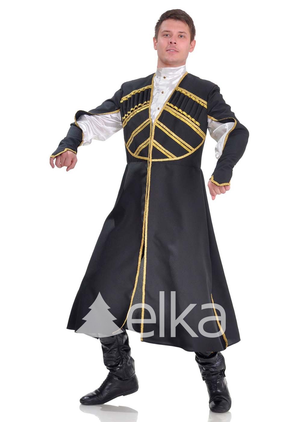 Изготовлен из высококачественных тканей: атласа, габардина и экокожи. Комплект составили: черкеска, брюки с имитацией обуви. Длинная черкесска чёрного цвета имеет свободный, чуть приталенный крой и длинные оригинальные рукава. Украшена золотой тесьмой. Элемент одежды, имитирующий обувь, выполнен из мягкой экокожи чёрного цвета. Грузинский костюм выполнен по мотивам традиционного народного костюма и подойдет для любого праздничного мероприятия.
