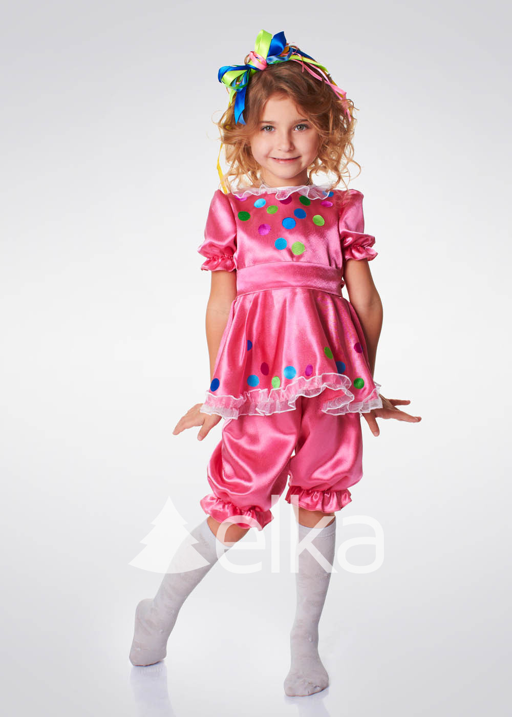 Карнавальный костюм Хлопушка включает в себя платье, пояс, бриджи и обруч. Атласное розовое платье с рукавами-фонариками украшено разноцветными кружками, придавая образу игривость и яркость. Подол платья и линия воротника украшены белоснежной прозрачной тесьмой, добавляя воздушность и легкость. Розовые бриджи придают костюму нежность и завершенность. Обруч в виде банта из разноцветных ленточек дополняет образ, создавая веселый и праздничный вид.
