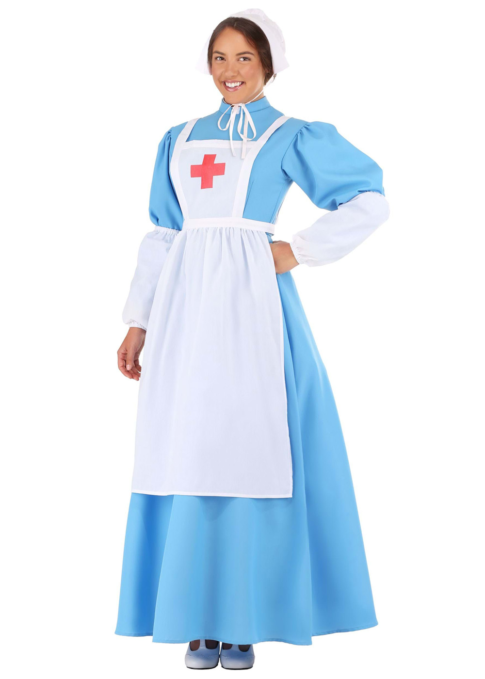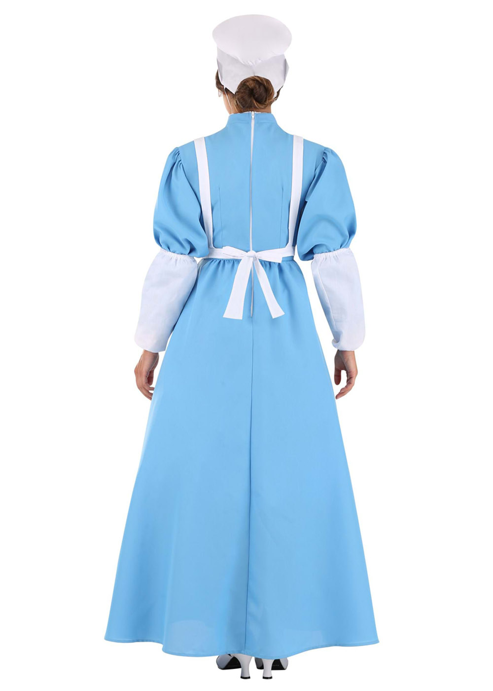 Этот костюм медсестры Клары Бартон включает платье с молнией на спине и встроенной подюпником. Рукава с объемом имеют эластичные манжеты. Фартук из с лямками на плечах и завязками на талии. На фартуке красный крест. Манжеты рукавов имеют резинки на каждом конце и надеваются на рукава платья.