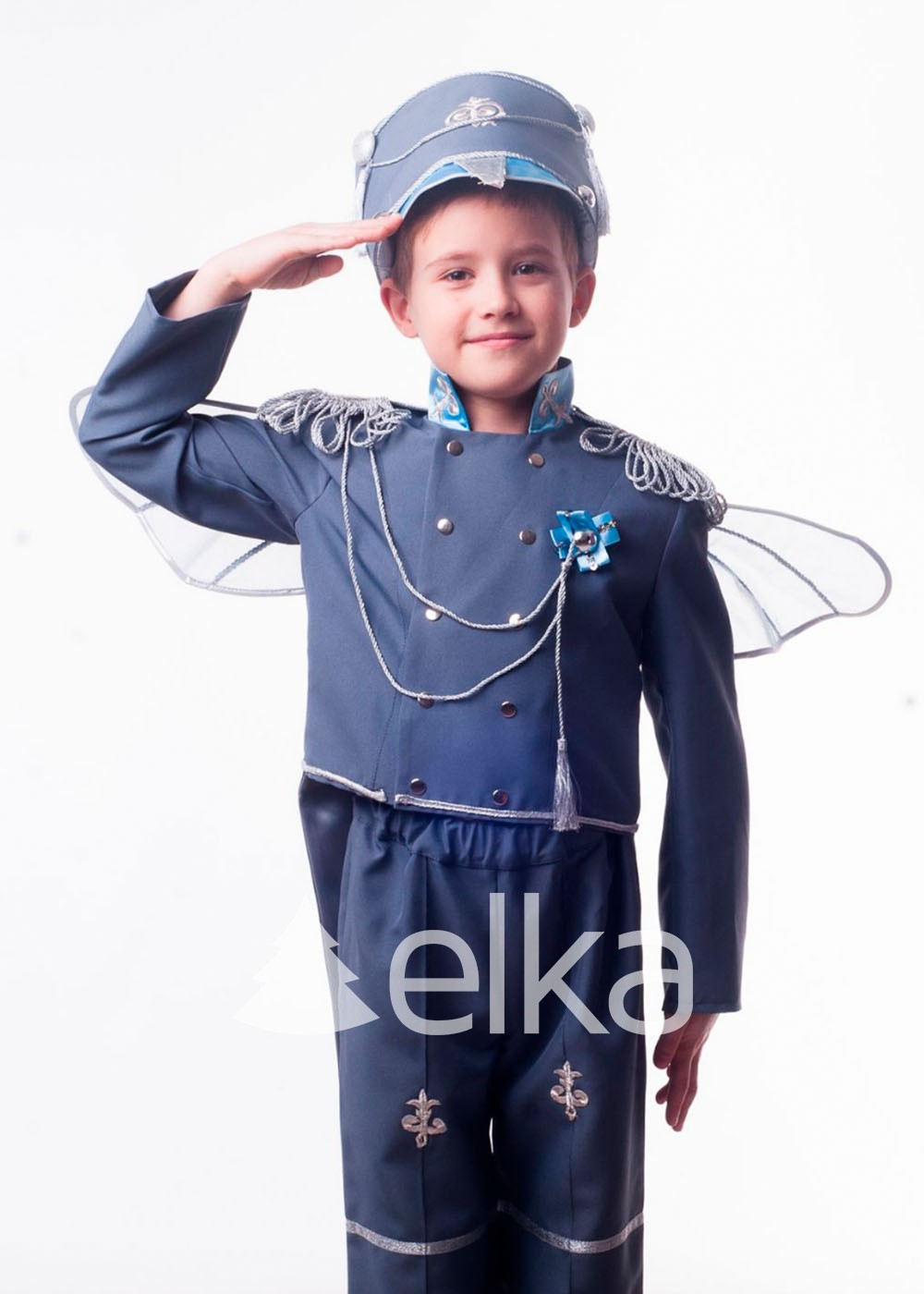 Карнавальный костюм Комарика для мальчика выполнен из высококачественных материалов. Комплект включает фрак, брюки и головной убор. Серый фрак с длинными крыльями на спине и блестящими вставками подчеркивает уникальность образа. Брюки удобного фасона дополняют наряд, а головной убор с антеннами завершает костюм, делая его незабываемым.