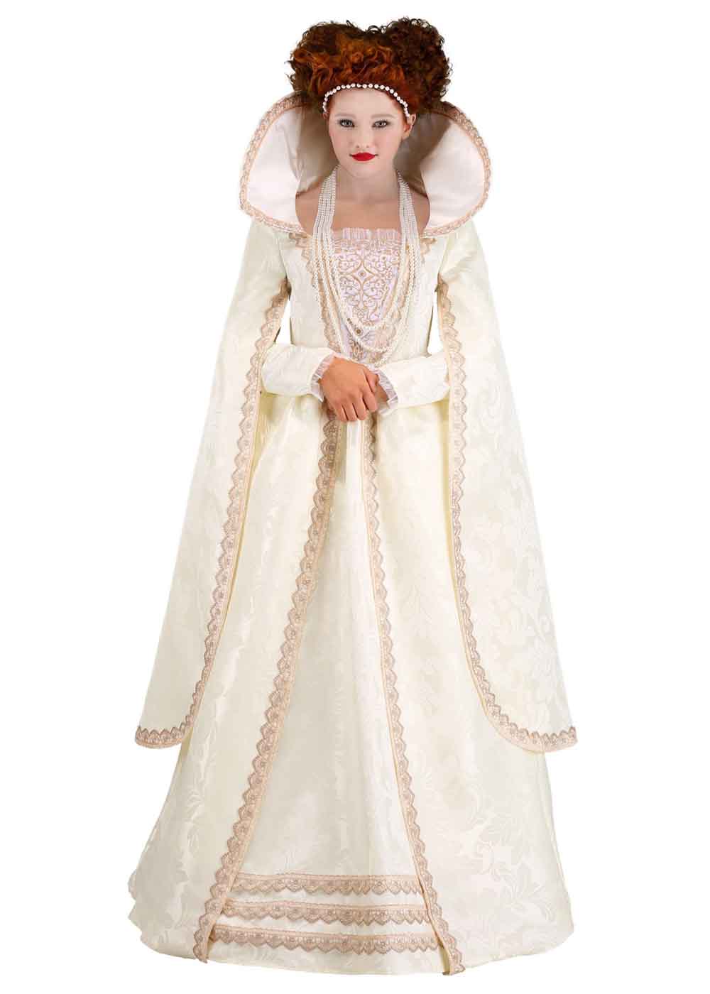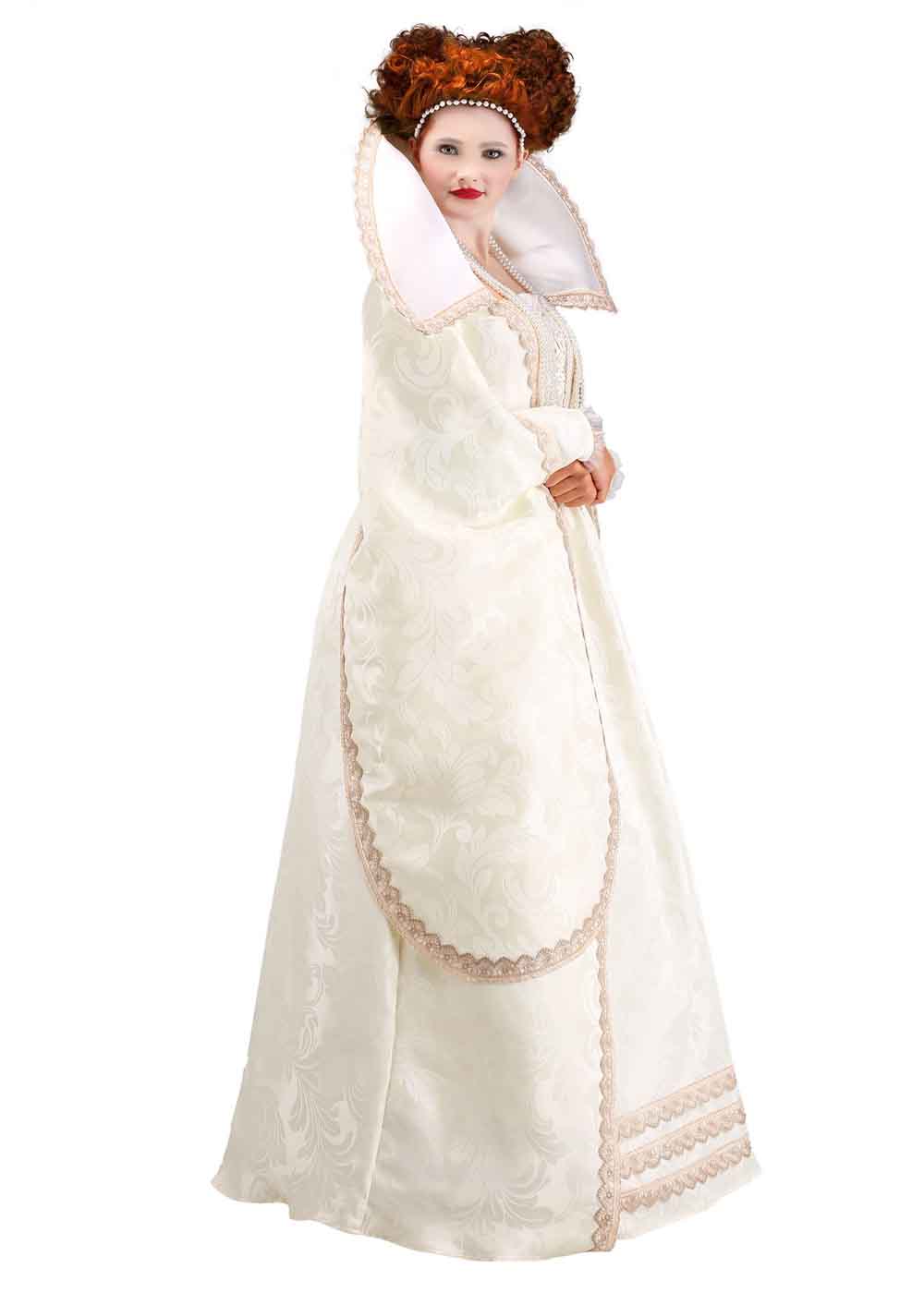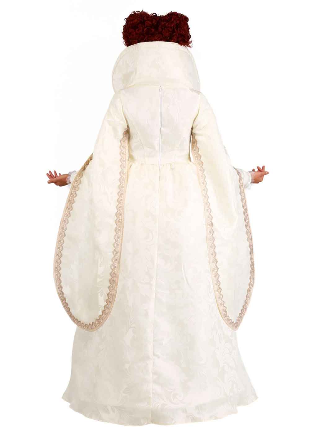 Превратитесь в королеву Елизавету I с этим роскошным костюмом! Платье с застежкой на молнии сзади выполнено из полиэстеровой дамасской ткани и имеет широкий стоячий воротник из поролона. Вышитая вставка на лифе, облегающие внутренние рукава и широкие драпированные внешние рукава придают костюму изысканность. Встроенная жесткая основа придает пышность в области талии, а кружевная отделка и кайма на подолах добавляют утонченности и величия.