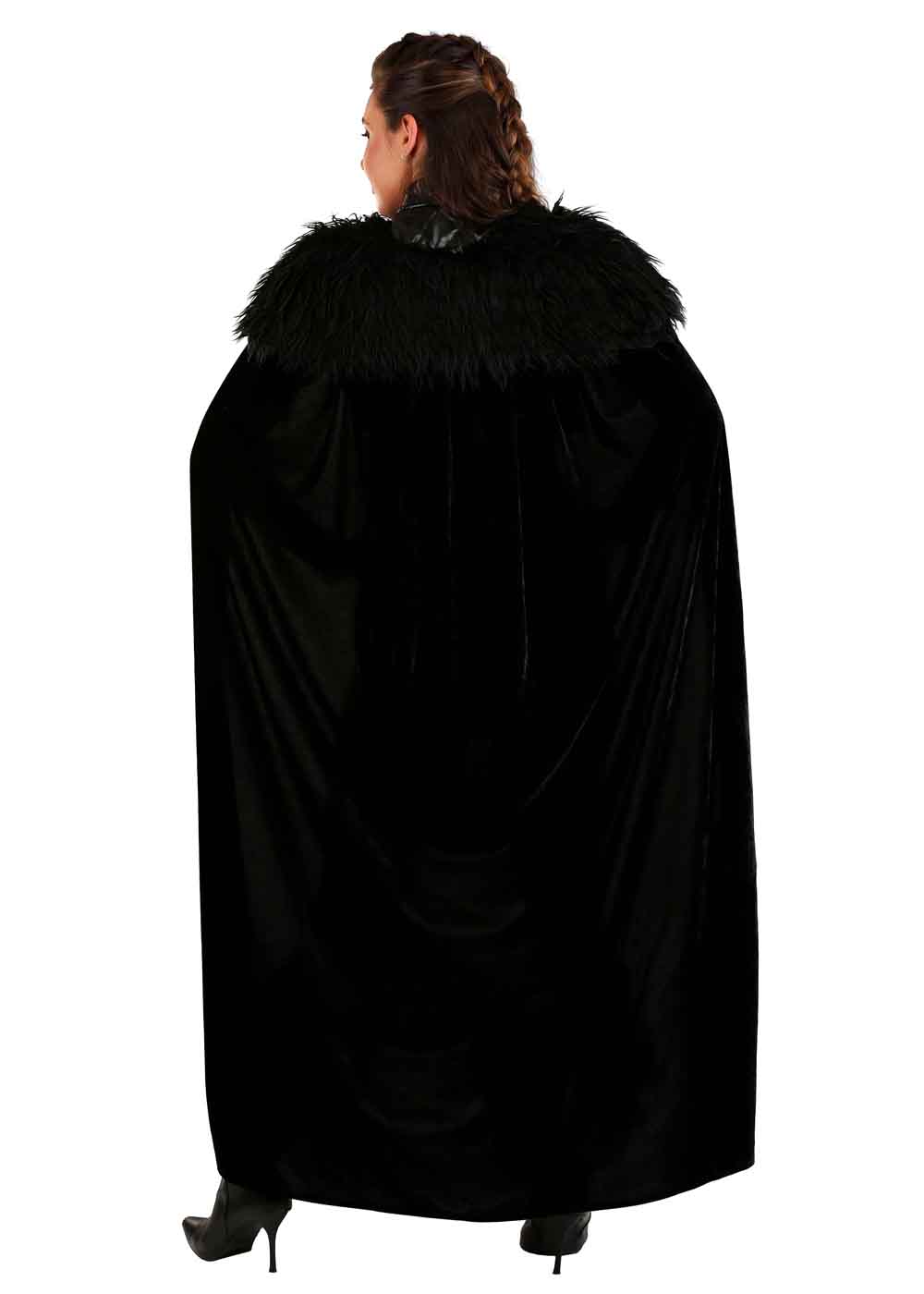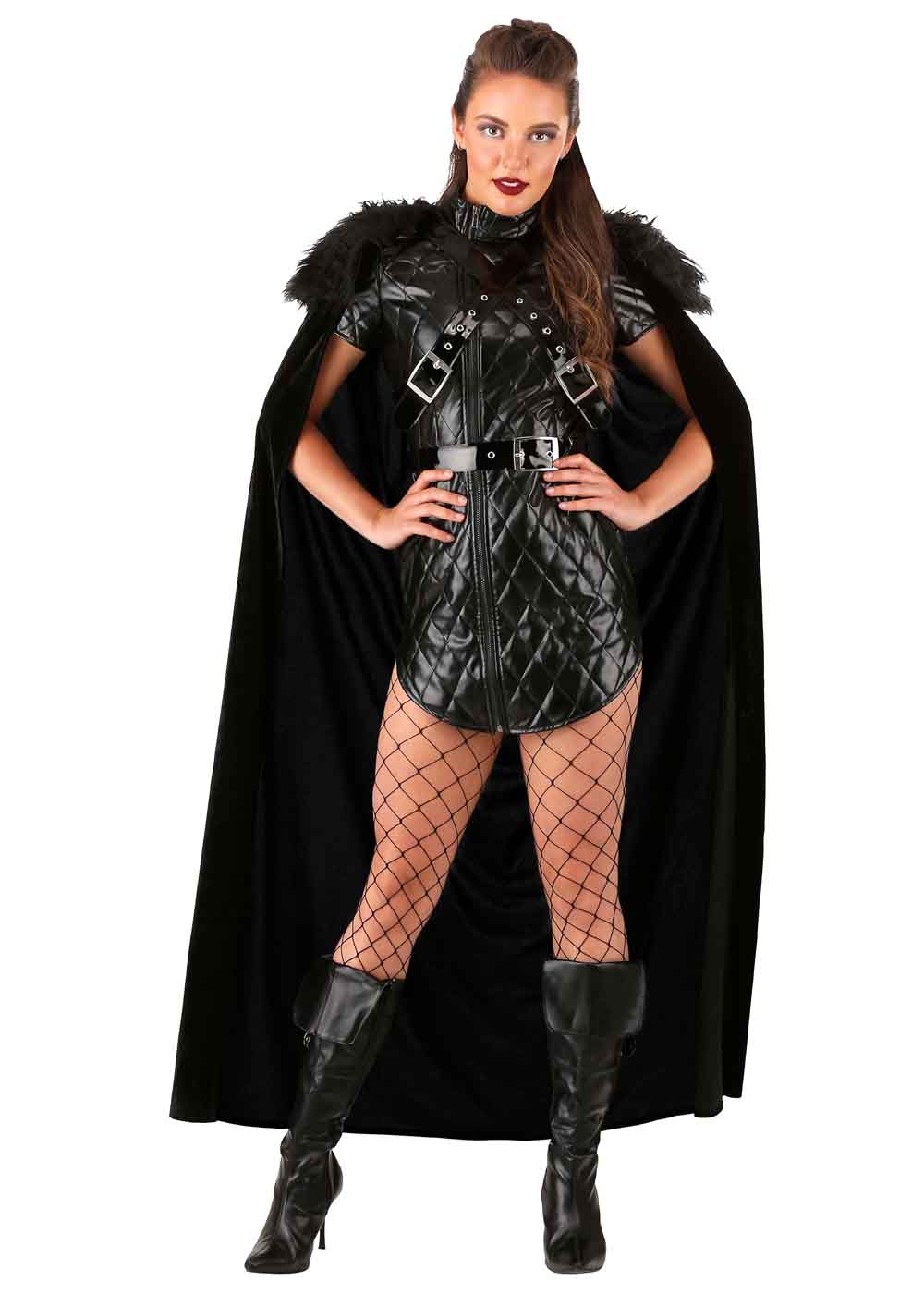 Воплотите образ королевы севера в этом эффектном костюме Джейн Сноу. Платье из искусственной кожи, бархата и меха имеет асимметричную переднюю молнию и очень короткий крой, поэтому рекомендуется носить под ним шорты для полного комфорта. Пояс с металлической пряжкой серебристого цвета дополняет образ. Бархатный плащ с широким воротником из длинноворсового искусственного меха закрепляется на спине кожаными ремешками и застегивается на металлические пряжки спереди.