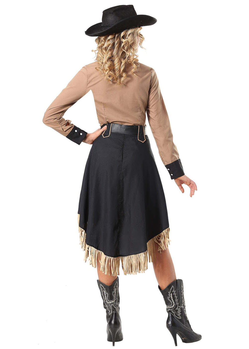 Готовьтесь к приключениям на Диком Западе в этом стильном костюме Ковбойши! Рубашка с застежками на кнопках спереди и на манжетах. Юбка с молнией, дополнена декоративной бахромой, которая создает атмосферу аутентичности и стиля. Шляпа из формованного фетра, обтянута пайетками. Пояс из искусственной кожи с металлической пряжкой добавит дополнительной дозы стиля и уверенности. В этом костюме вы будете готовы к любым приключениям на Диком Западе!