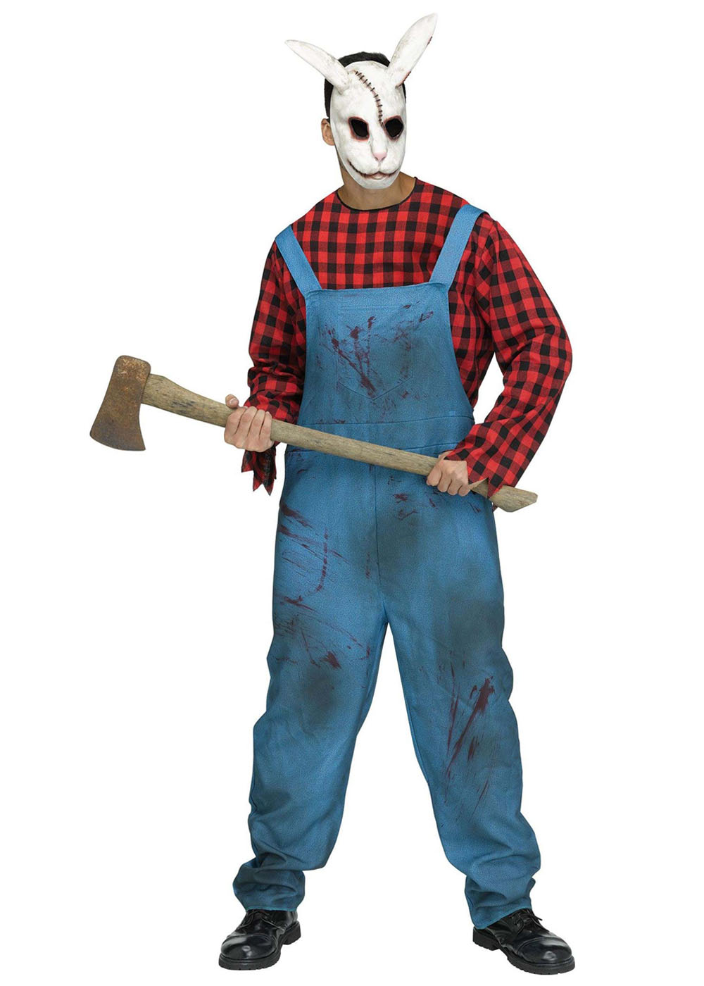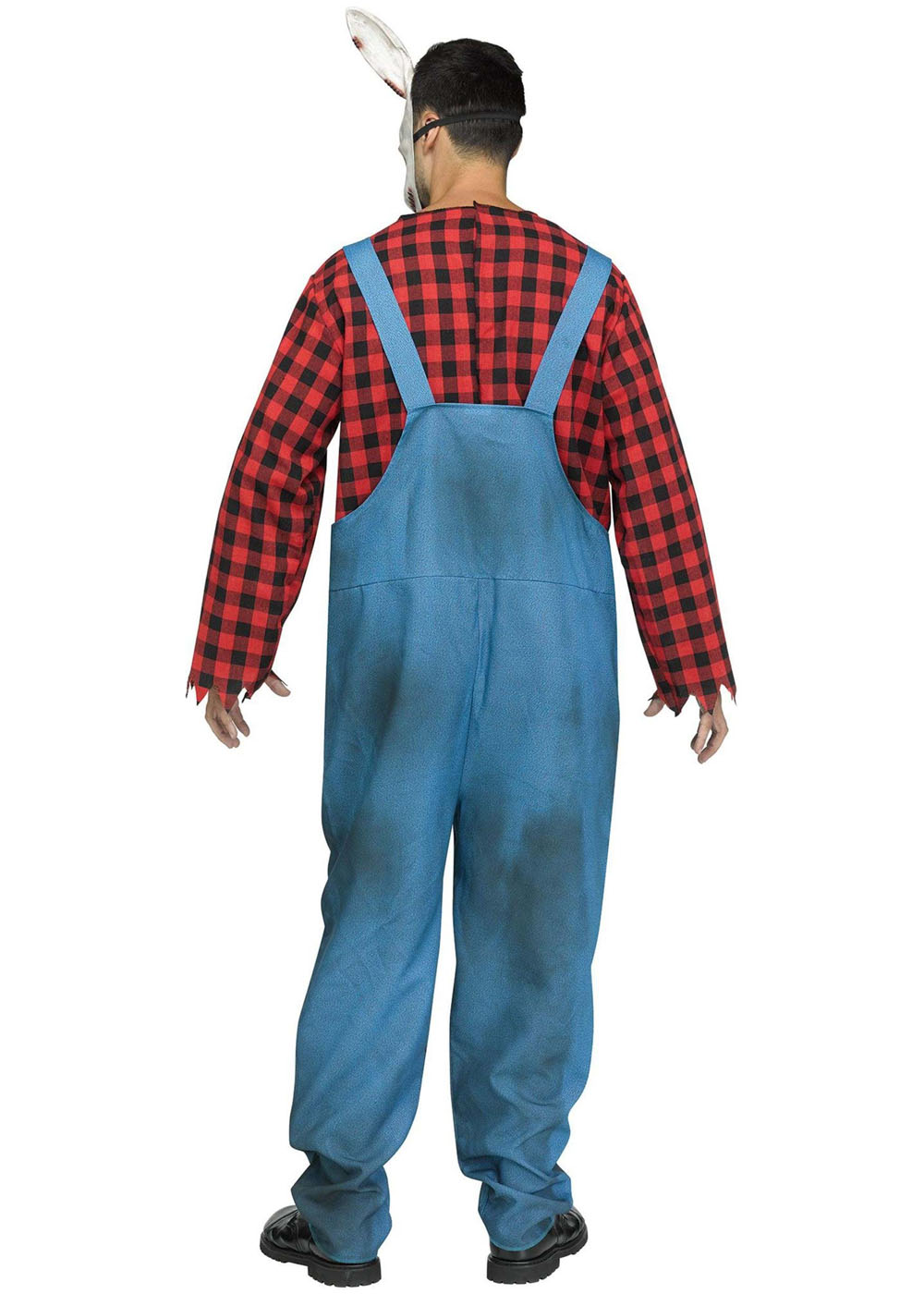 Костюм кролика-убийцы включает в себя рубашку в клетку с застежкой на липучке в задней части шеи, комбинезон с кровавым видом, а также латексную маску с отверстиями для обзора и эластичной лентой для крепления на голове.
