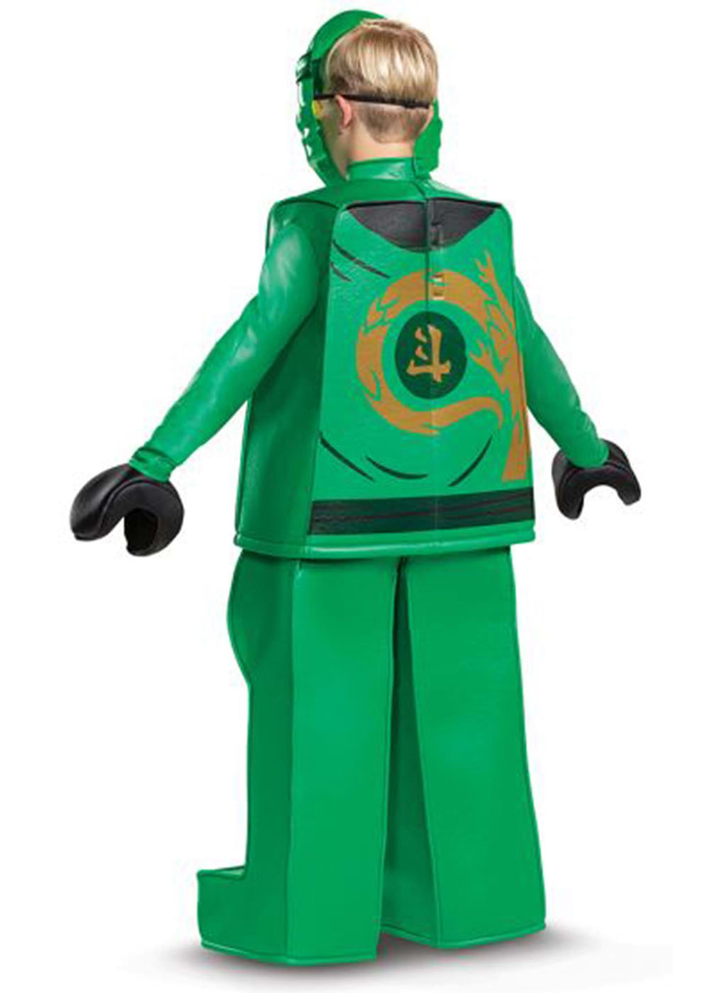 Костюм зеленого ниндзяго включает в себя квадратную кофту с мягкой подкладкой, который застегивается на липучки на затылке. На передней и задней сторонах кофты нанесены графические изображения. Штаны с мягкой подкладкой имеют эластичный пояс, а также прикрепленные накладки на обувь. На передней стороне брюк также нанесены графические изображения. Маска покрывает всё лицо и имеет эластичную ленту вокруг головы.