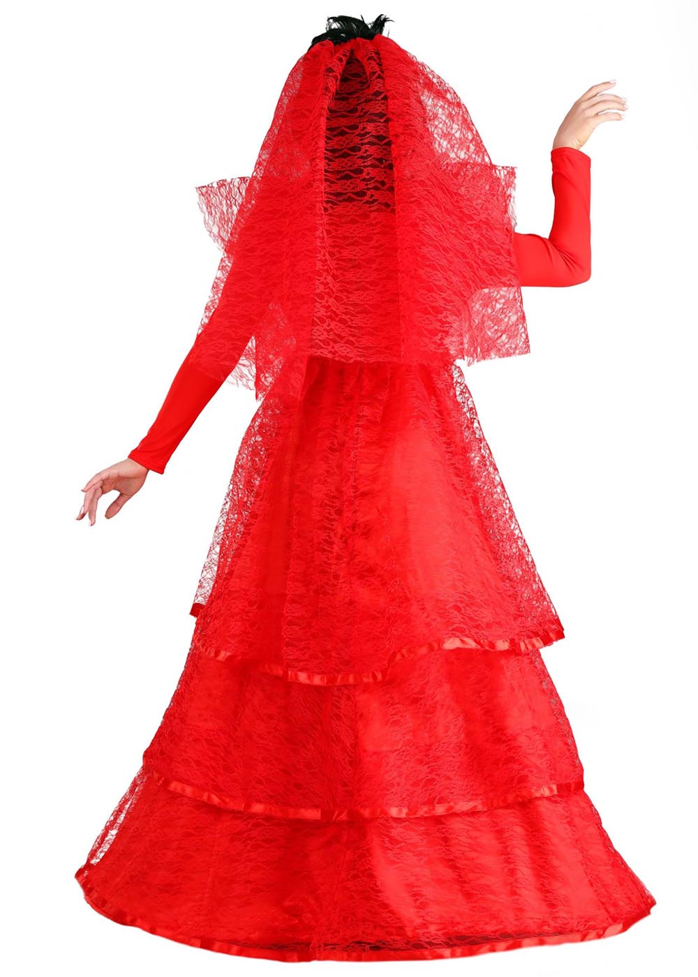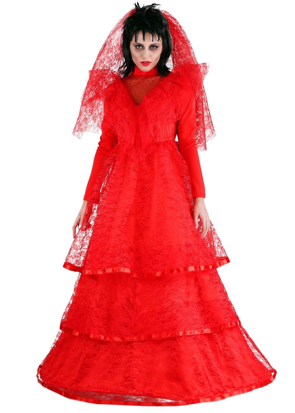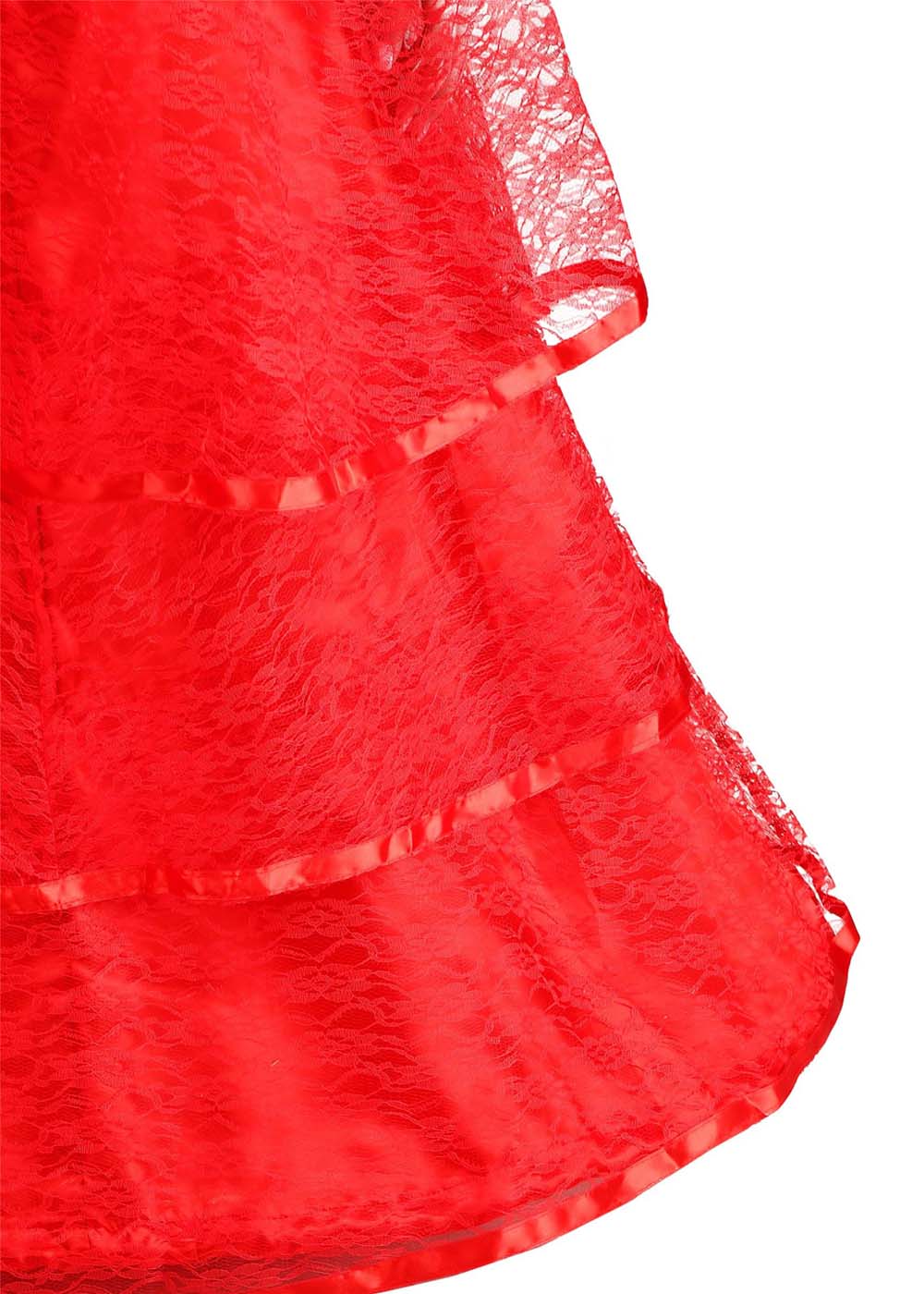 Красное готическое свадебное платье представляет собой корсет и юбку из атласа. Платье застегивается на молнию сзади. Воротник из тюли с широким ободком из кружева. Юбка состоит из трех ярусов кружева с каймой из атласной ленты поверх атласного основания.