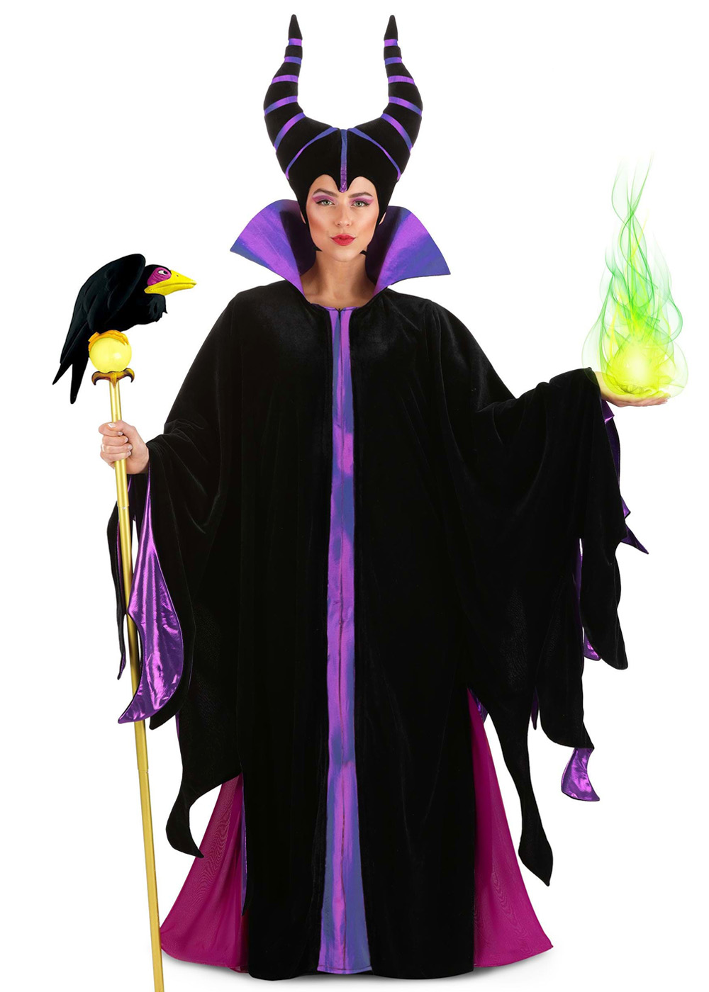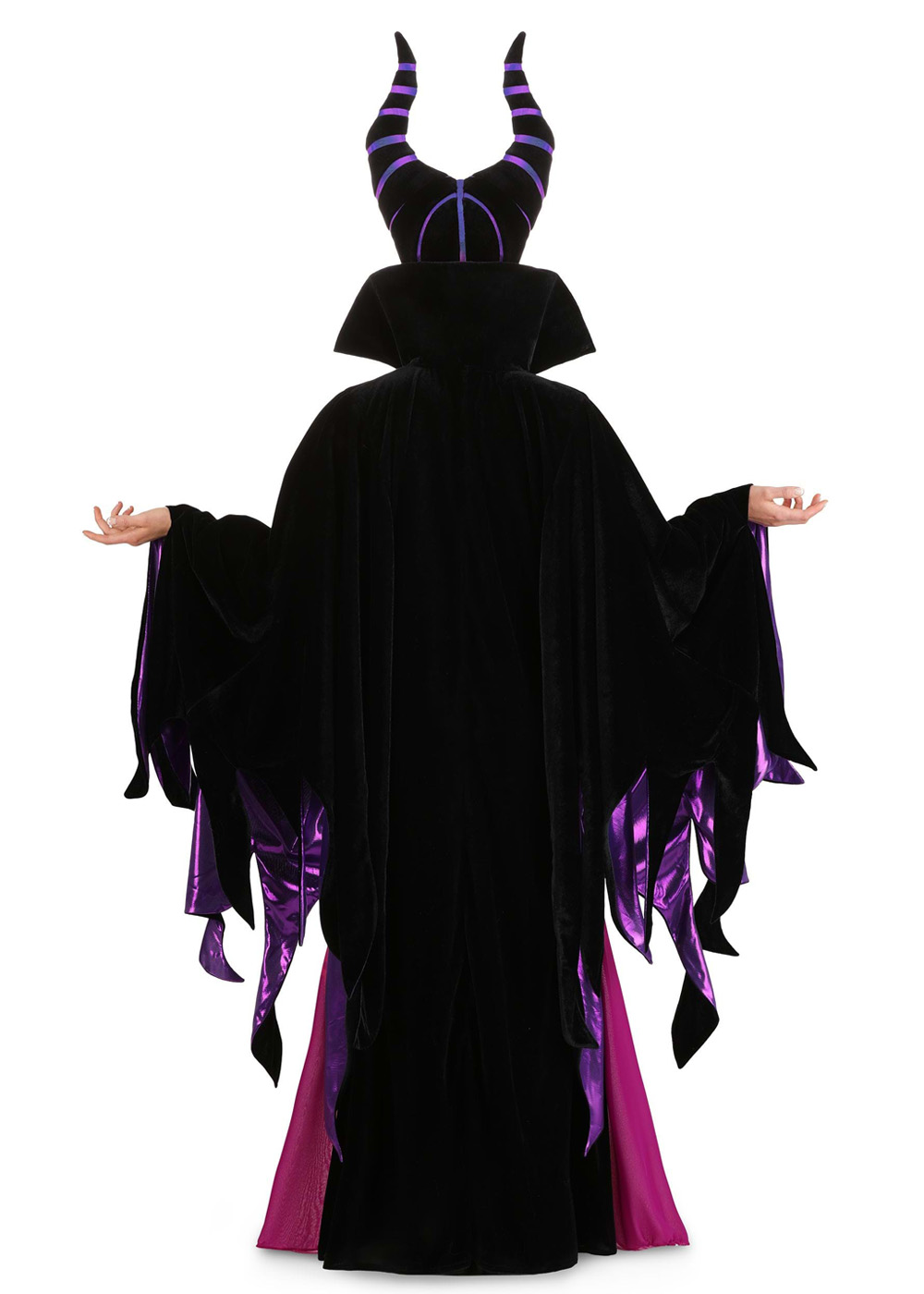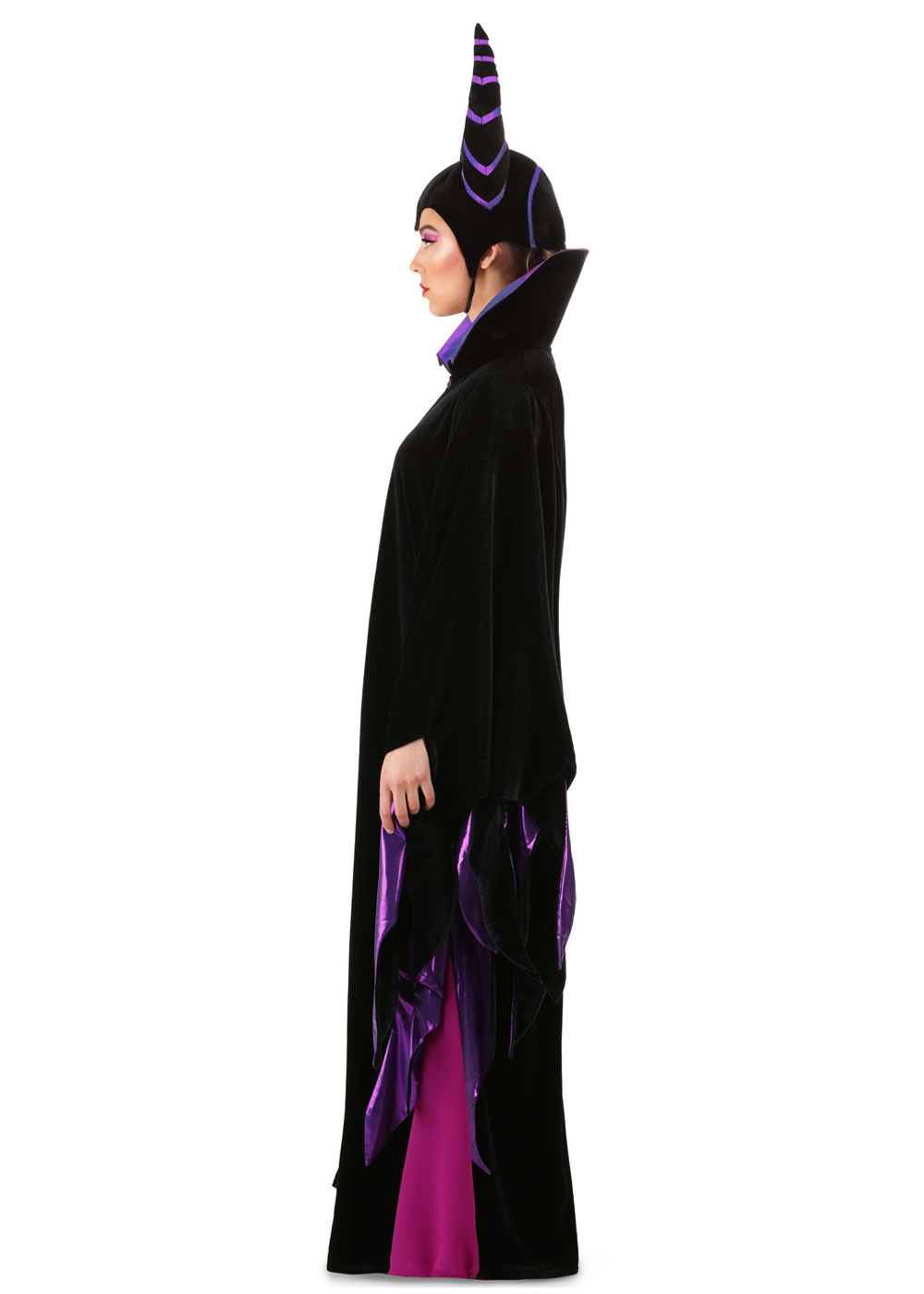Классический костюм Малифисенты выполнен из платья из бархата с невидимой молнией спереди по центру. Воротник и платье выполнены из двухцветной ткани: розового и пурпурного. Головной убор из бархата наполнен синтепоном и украшен деталями. Внутри ободка головного убора есть эластичная лента для регулировки размера, а ремешки помогают закрепить его под подбородком.