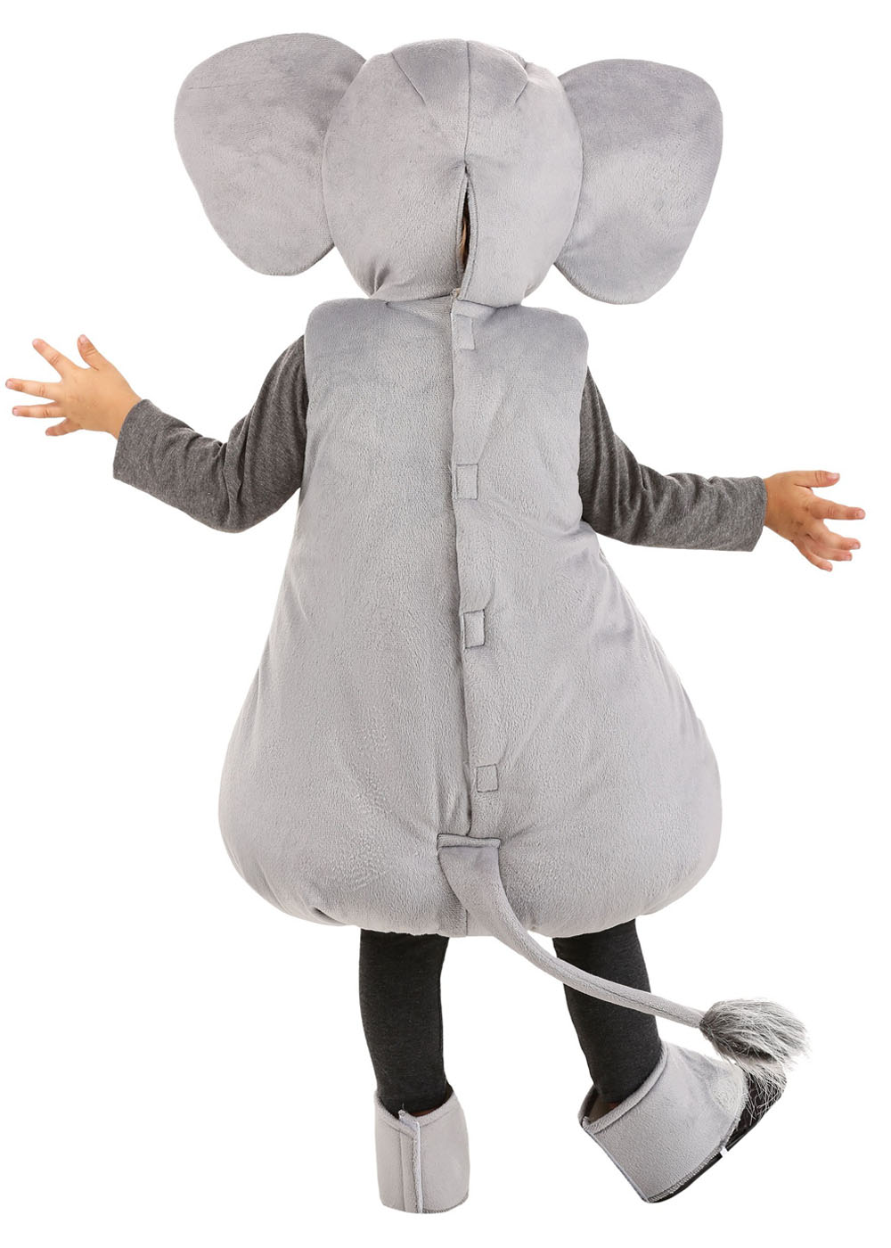 Костюм маленького слоника изготовлен из мягкой вельветовой ткани с наполнителем из синтепона. Кофта с капюшоном на липучки с липучкой по центру спины. Искусственный мех на кончике хвоста, пришит на спину костюма. Ботинки из вельвета с наполнителем и липучкой на пятках с эластичной лентой на подошве.