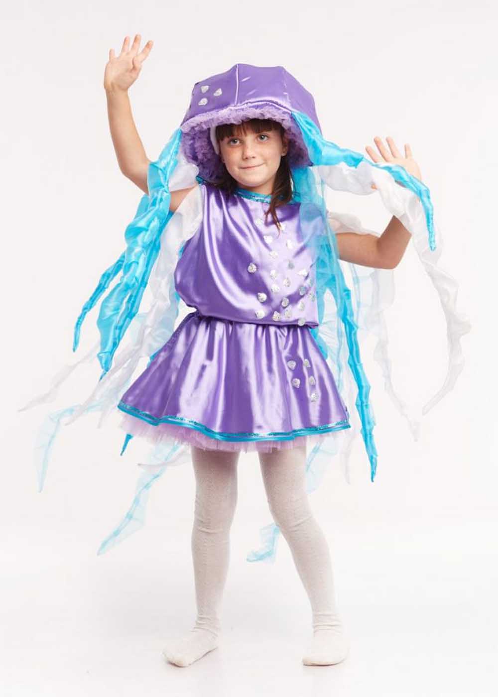 Подарите вашей девочке волшебный образ морской медузы с этим изысканным костюмом! Платье и шапочка создают полный и очаровательный образ, идеально подходящий для детских праздников и костюмированных мероприятий. Костюм выполнен из креп-сатина, фатина и органзы, что придаёт ему лёгкость и воздушность. Ваша маленькая медуза будет выглядеть великолепно и привлекать всеобщее внимание!