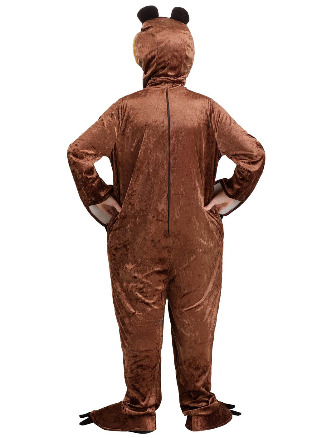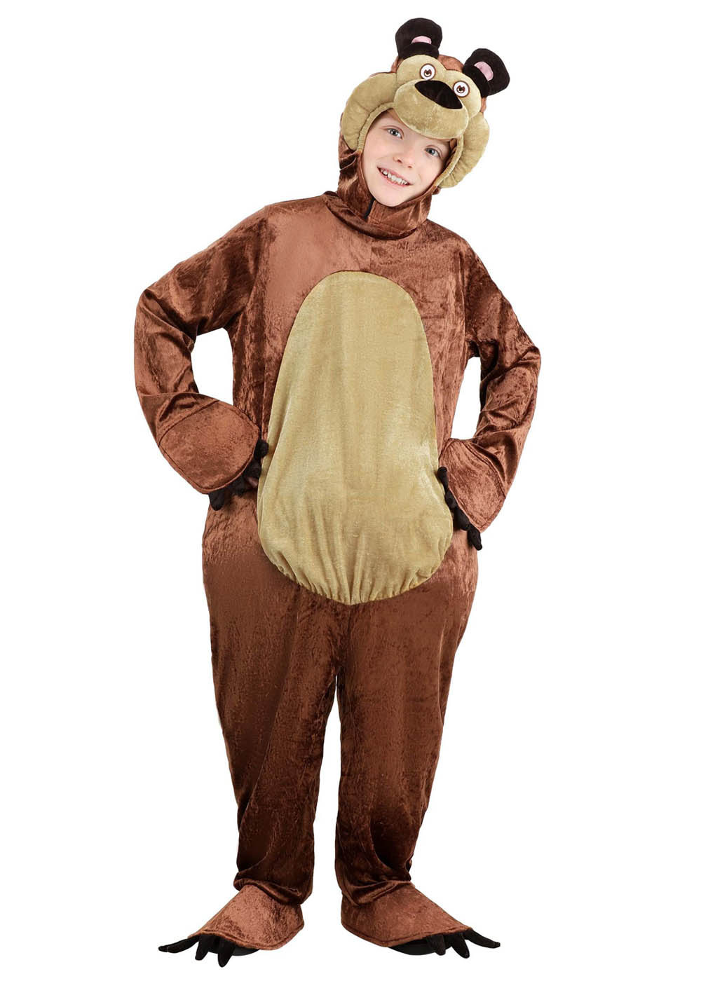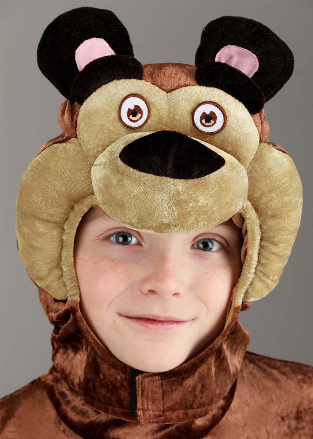 Детский костюм "Маша и Медведь" включает комбинезон с молнией на спине для легкого одевания. Внутри живота нашита подушка с наполнителем из синтепона, чтобы создать объемный вид. На манжетах рукавов нашиты "лапы" из пены с эластичной лентой вокруг ладоней и мягкими когтями на кончиках. Накладки на обувь из пены имеют эластичную ленту подошвы и мягкие когти на кончиках. Головной убор имеет застежку на липучке под подбородком.