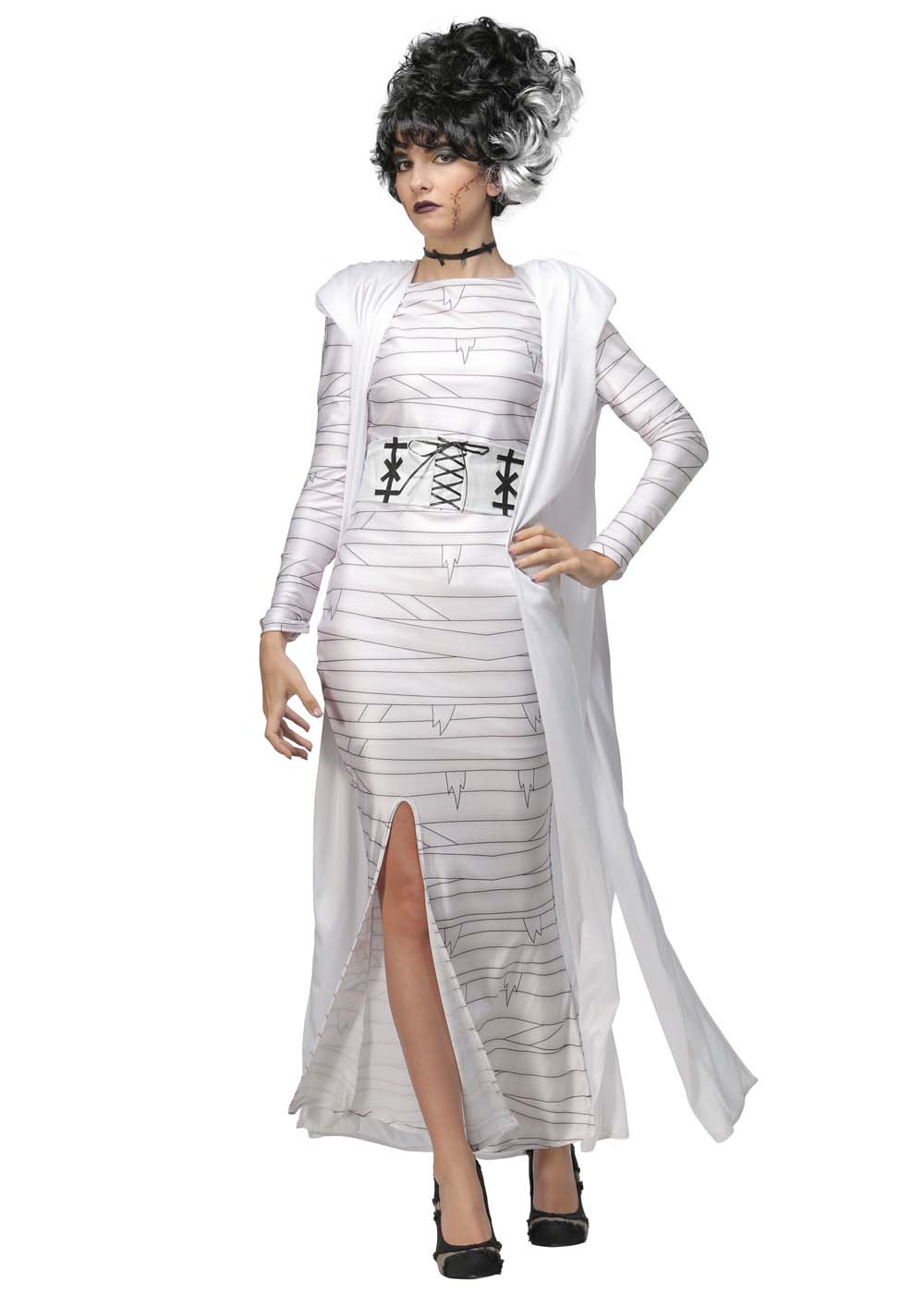 Костюм Невесты Франкенштейна для женщин включает в себя платье из полиэстера, с подкладкой. В нем есть разрез, начинающийся у верхней части колена, и пояс с эластичной лентой на задней стороне, закрепленной на липучке.