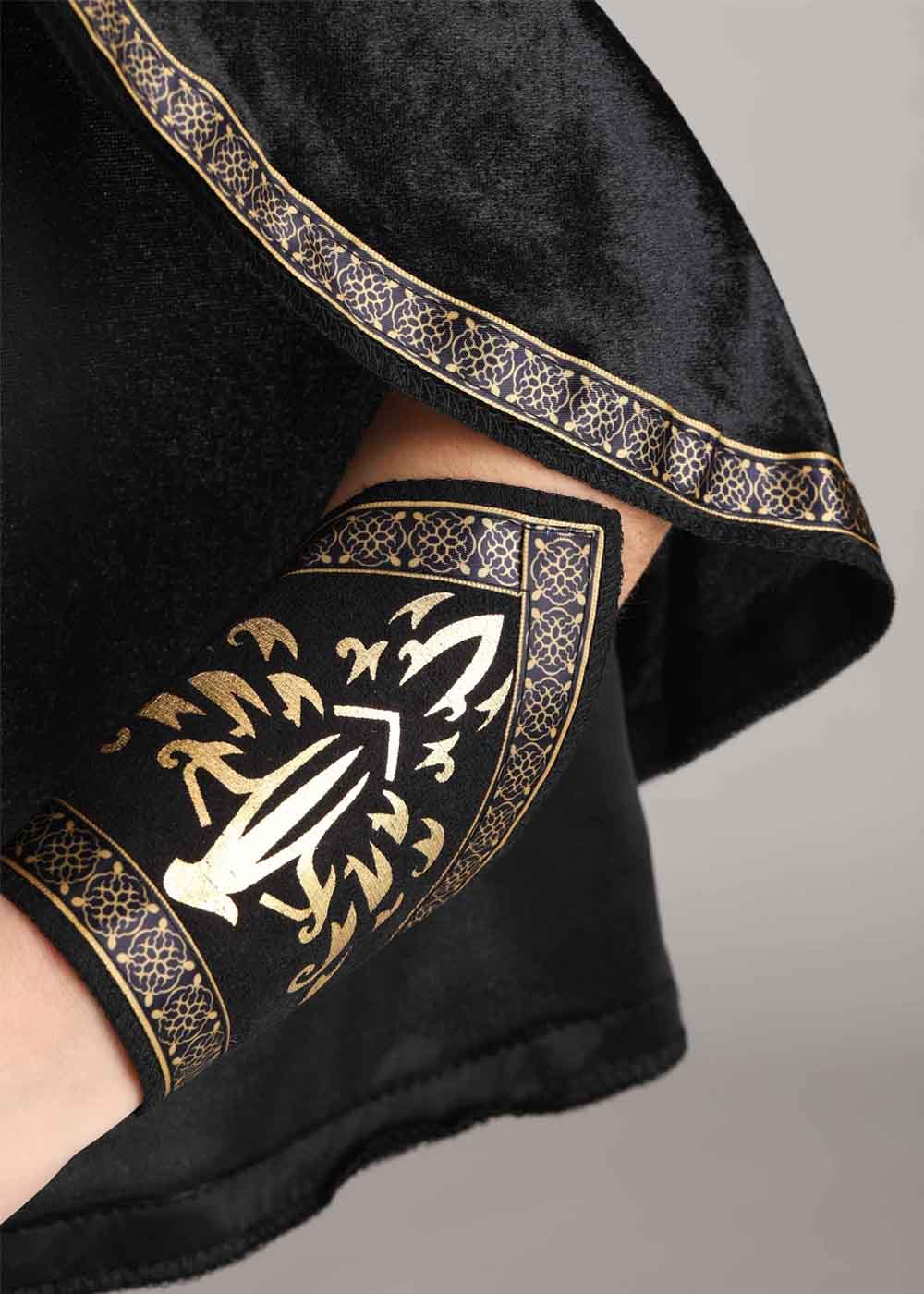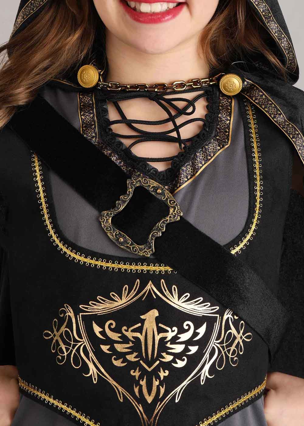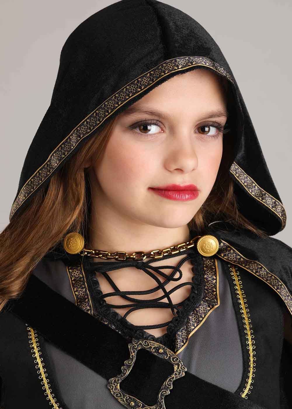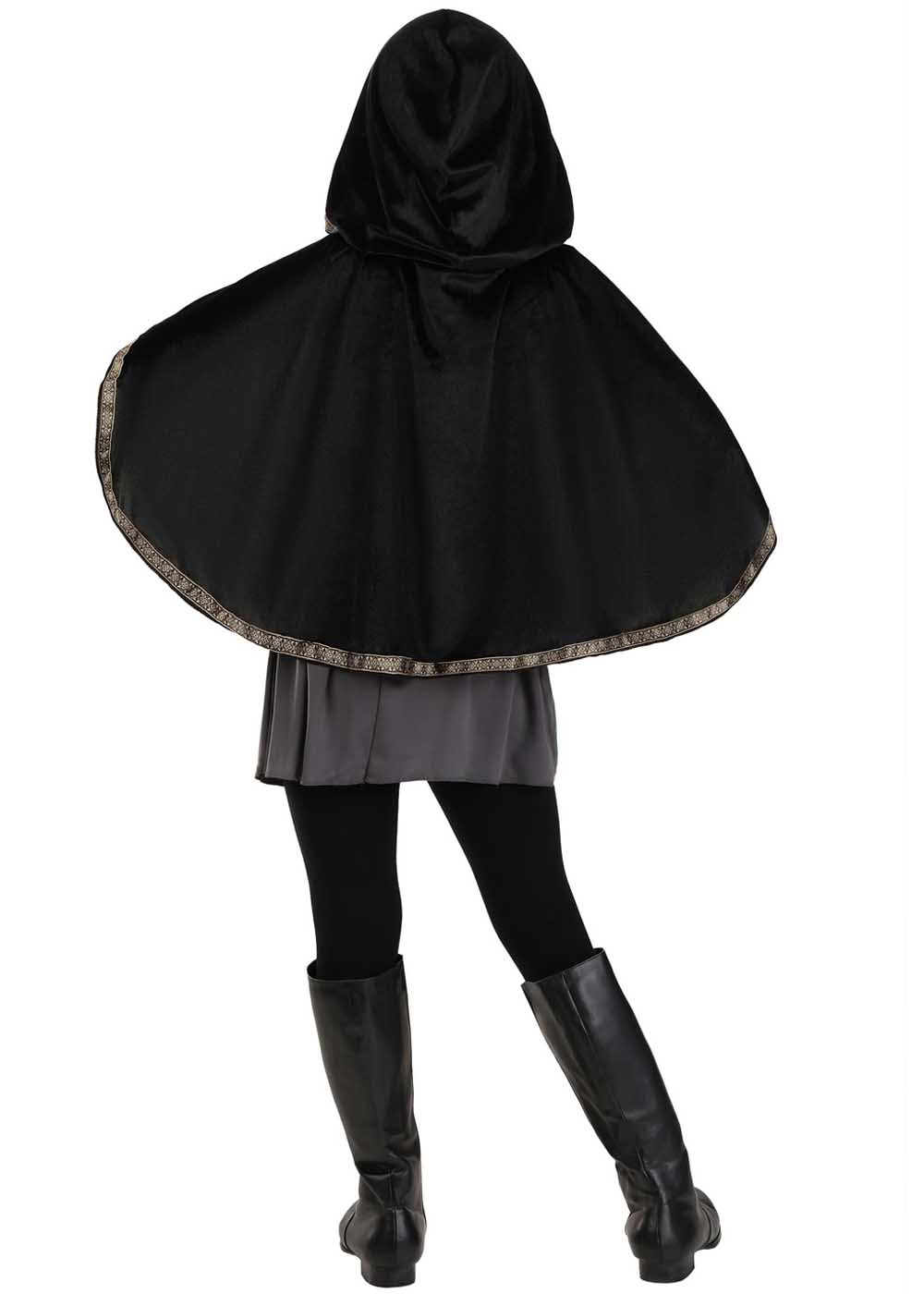 Костюм Охотника погружает в мир приключений. Кофта застегивается на крючок на спине и украшена лентой и тесьмой. Плащ с капюшоном и пластиковая цепочка добавляют оригинальности. Корсет имеет эластичную спинку и завязки, а также застегивается с помощью липучки. Ремень с пластиковой пряжкой и липучкой подчеркивает стиль. Манжеты на запястьях с печатной графикой и лентой фиксируются на руке, придавая завершенность образу.