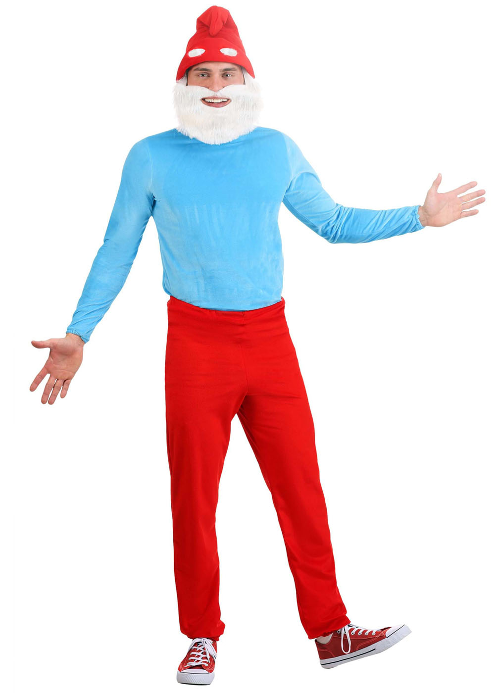 Изготовленный из мягкого велюра и искусственного меха, костюм папы Смурфика обеспечивает комфорт и удобство благодаря молнии на спине рубашки, эластичной резинке на брюках и мягкому меховому хвосту, создавая неповторимый образ с помощью шапки с подкладкой, а также мягкой меховой бороды и усов, крепящихся на кромке шапки с помощью липучек.