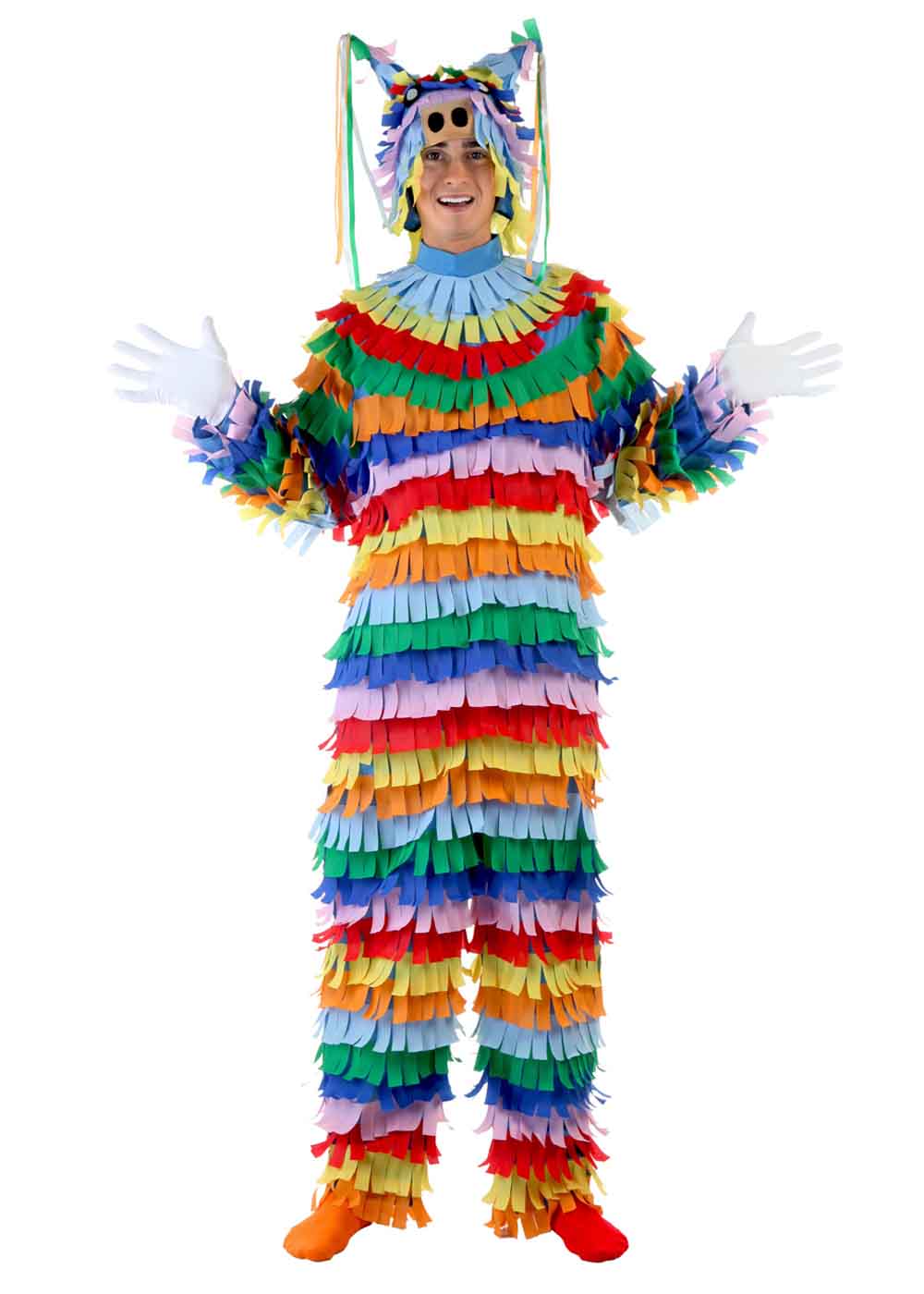 Костюм пиньяты выглядит ярко и весело! Костюм состоит из комбинезона, который застегивается на молнию сзади, а также имеет петлю на воротнике для липучки. На всем комбинезоне расположены несколько рядов яркой многоцветной бахромы. Шляпа украшена пришитыми рогами и покрыта многоцветной бахромой.