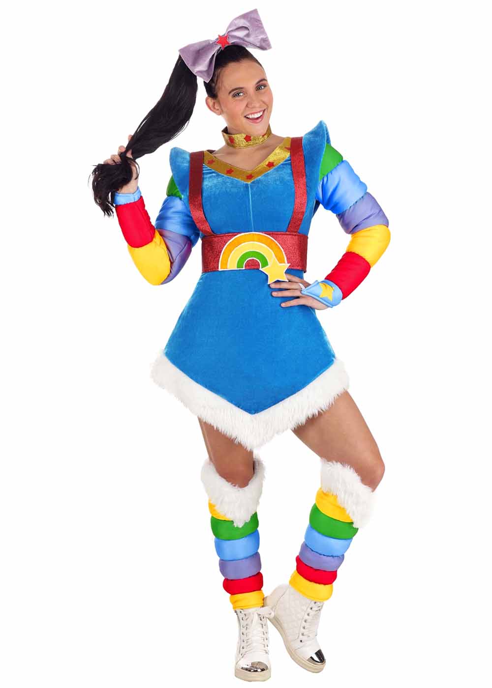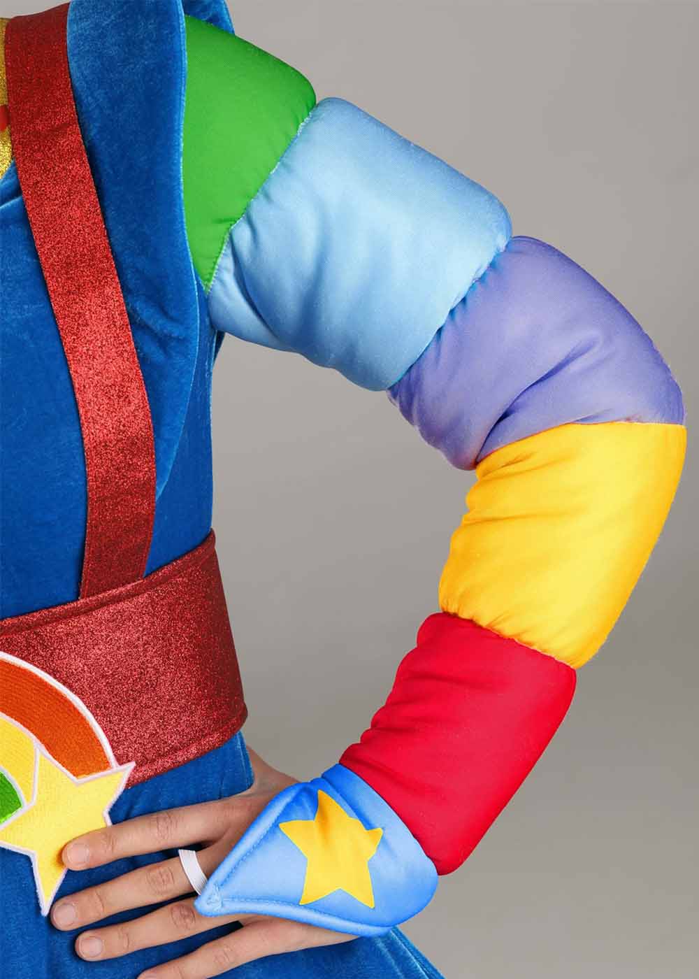 Костюм Радуги наполнен яркими цветами и весельем. Платье с молнией на спине сочетает стиль и комфорт. Рукава разных цветов и пышный воротник со звездами добавляют игривости. Накладки на ботинки и блестящая шлейка с радугой завершают образ. Чокер с блестками и бархатный фиолетовый бант с красной звездой делают наряд особенно эффектным.