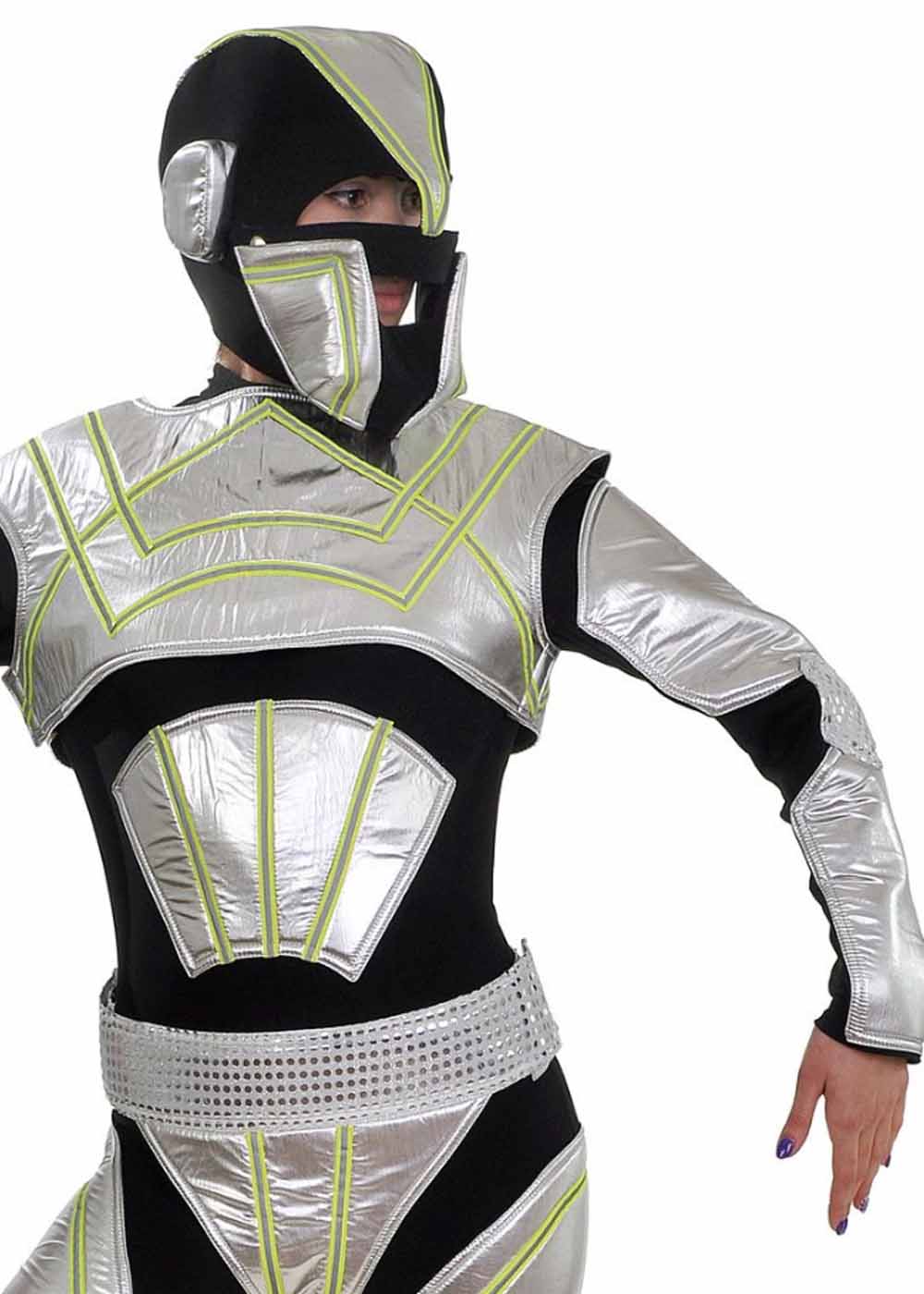 Костюм робота для девушки состоит из комбинезона и шлема. Наряд отделан светоотражающими полосками, которые светятся в темноте, придавая образу футуристический вид. Комбинезон эластичный и удобный, обеспечивая свободу движений. Шлем дополняет образ, создавая впечатление настоящего робота.