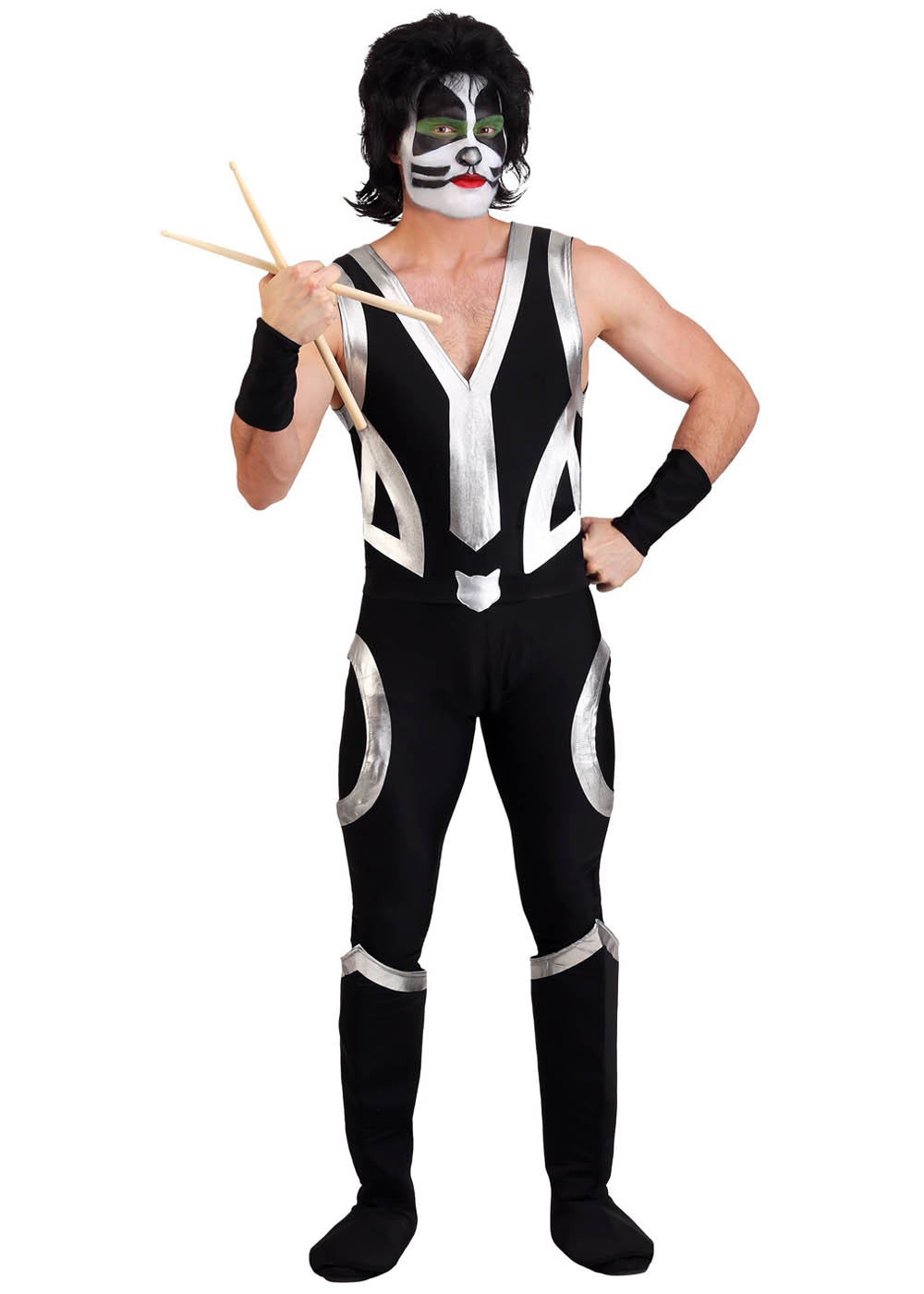 Костюм Кота из группы KISS включает костюм с открытым верхом и вырезом, украшенный окантовкой. На бедрах есть серебристые отверстия. Перчатки выполнены из эластичного черного материала, чтобы плотно облегать руки. Черный пояс с принтом на передней стороне.