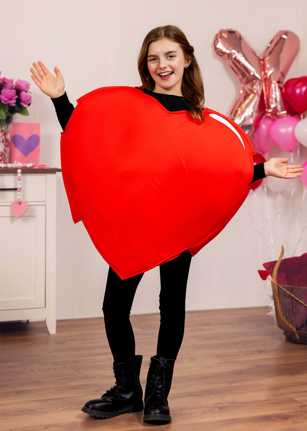 Детский костюм красного сердца имеет отверстия для шеи, рук и ног. На левом плече кофты нанесен эффект белого свечения.