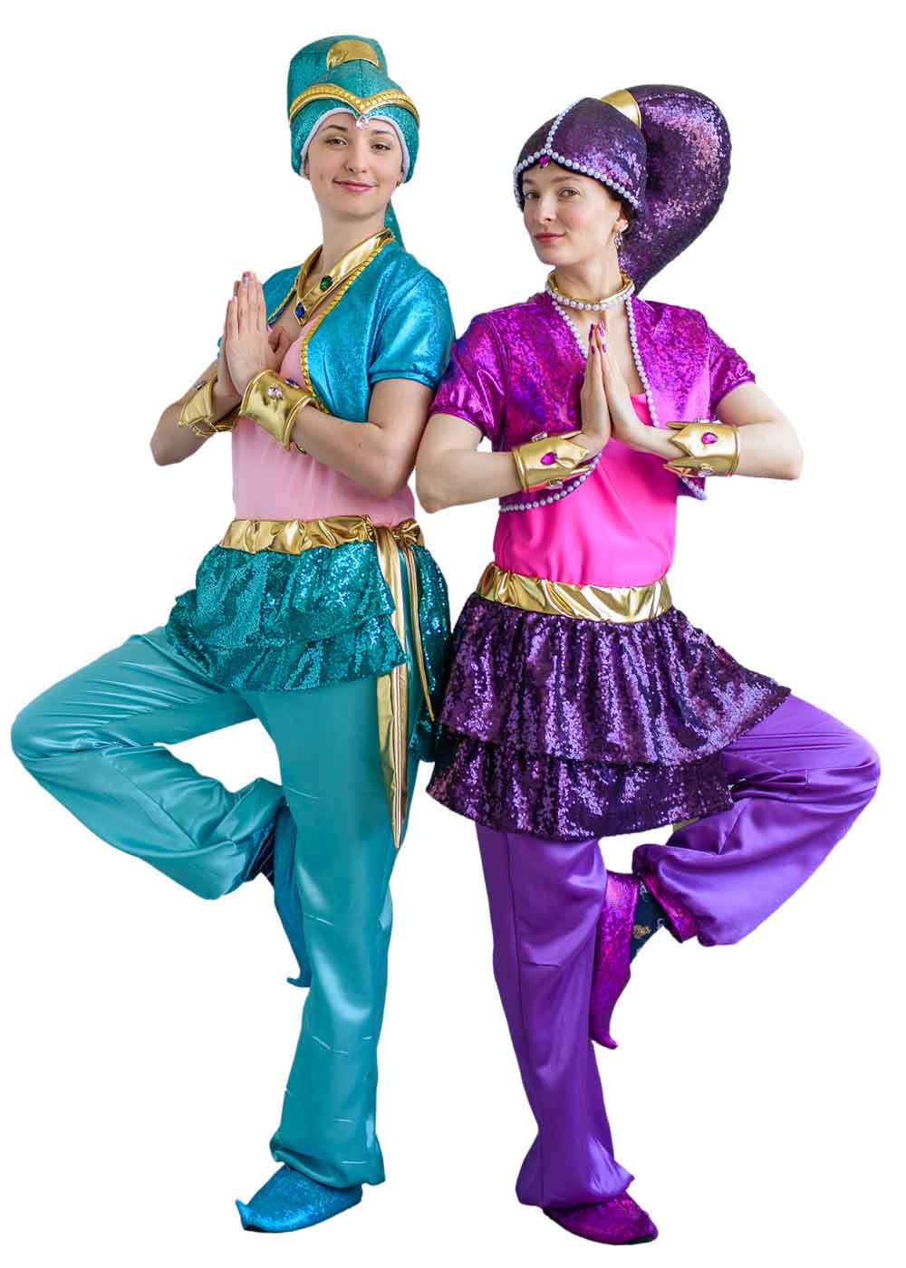 Костюм Шайн для аниматора состоит из трикотажной кофты розового цвета с коротким рукавом. Болеро выполнено из трикотажной ткани голубого цвета с лазерным эффектом, окантовка украшена золотой тесьмой. Юбка-пояс и головной убор сделаны из ткани с пайетками. В пояс юбки вшита резинка, выделенная золотым цветом. Шаровары сшиты из атласа. Обувь, украшение на шею и на руки завершают образ.