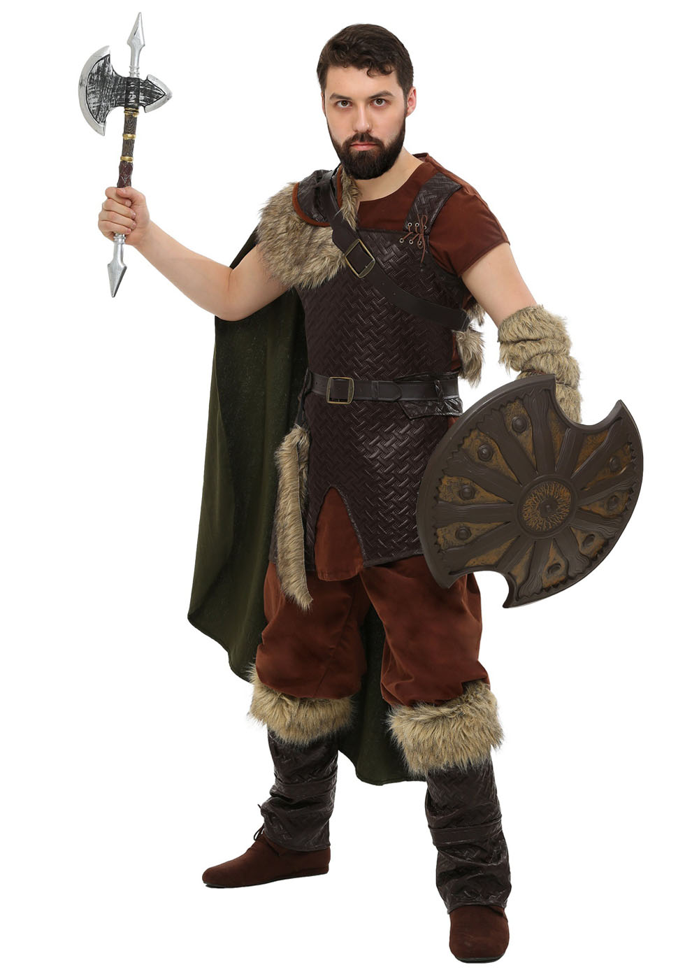 Северный костюм викинга включает в себя множество элементов. Кофта с короткими рукавами и V-образным вырезом с накидкой из искусственной кожи. Брюки с эластичным поясом и манжетами. Пояс из искусственной кожи дополнен пряжками из античной латуни. Плащ с широким воротником из искусственного меха и ремень из искусственной кожи с отверстиями. Накладки на ботинки из искусственной кожи. Оружие и щит продаются отдельно.