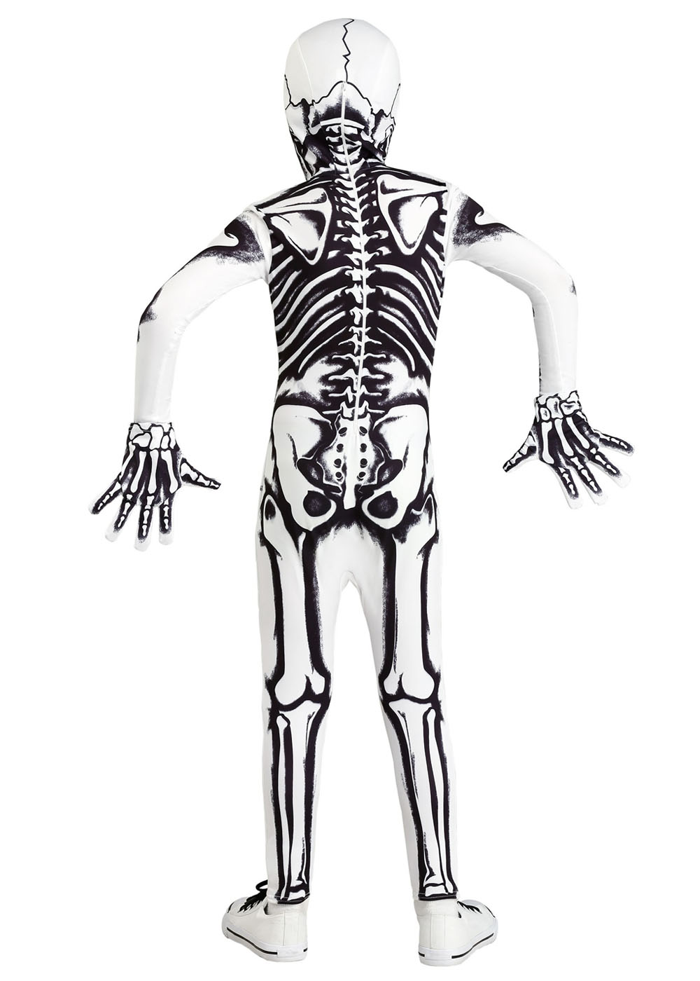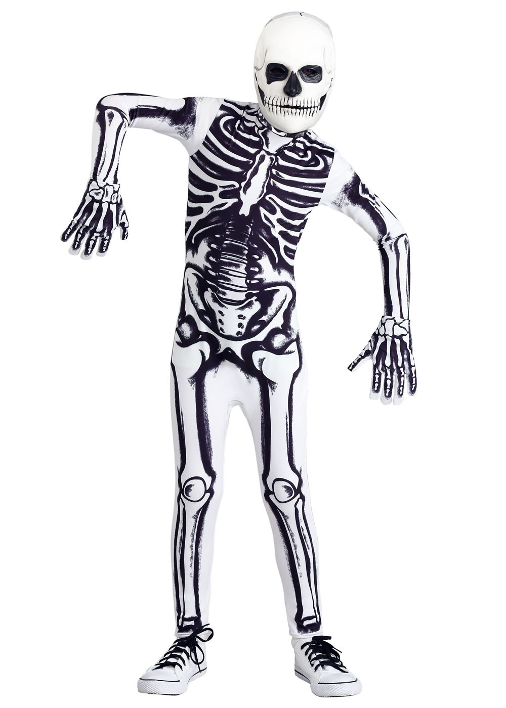 Костюм скелета включает в себя комбинезон с капюшоном и задней молнией от талии до капюшона. На передней и задней сторонах комбинезона нанесен рисунок скелета. Литая маска имеет эластичную ленту вокруг задней части головы. Маска имеет отверстия для глаз. Перчатки длиной до запястья с нанесенными костями на спине и ладонях.