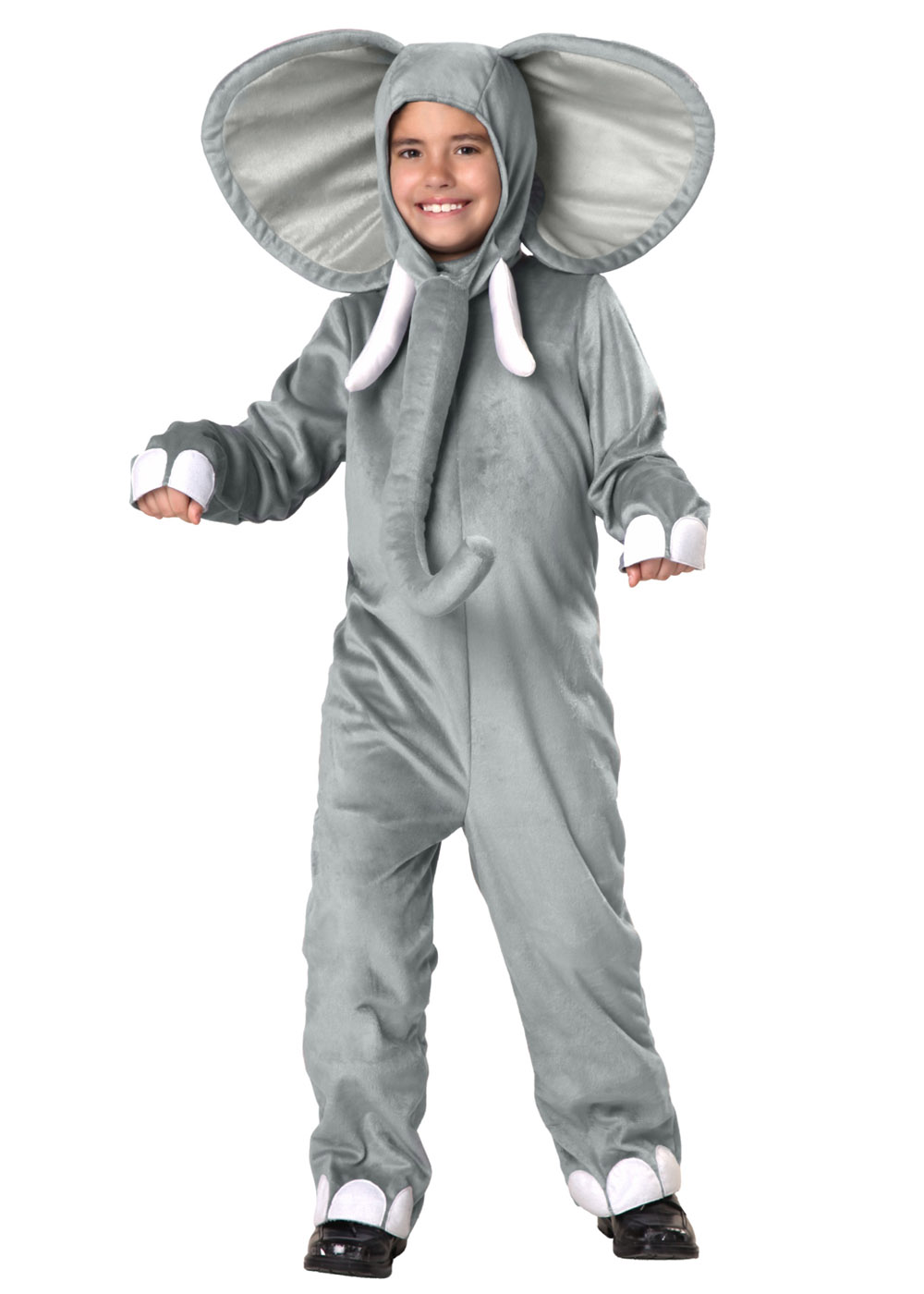 Детский костюм слона изготовлен из вельвета. Комбинезон застегивается на липучках на спине. Манжеты брюк и рукавов украшены "когтями из фетра. Плюшевый хвост с искусственным меховым пучком пришит на спину комбинезона. К голове костюма пришит хобот и ушки слона.