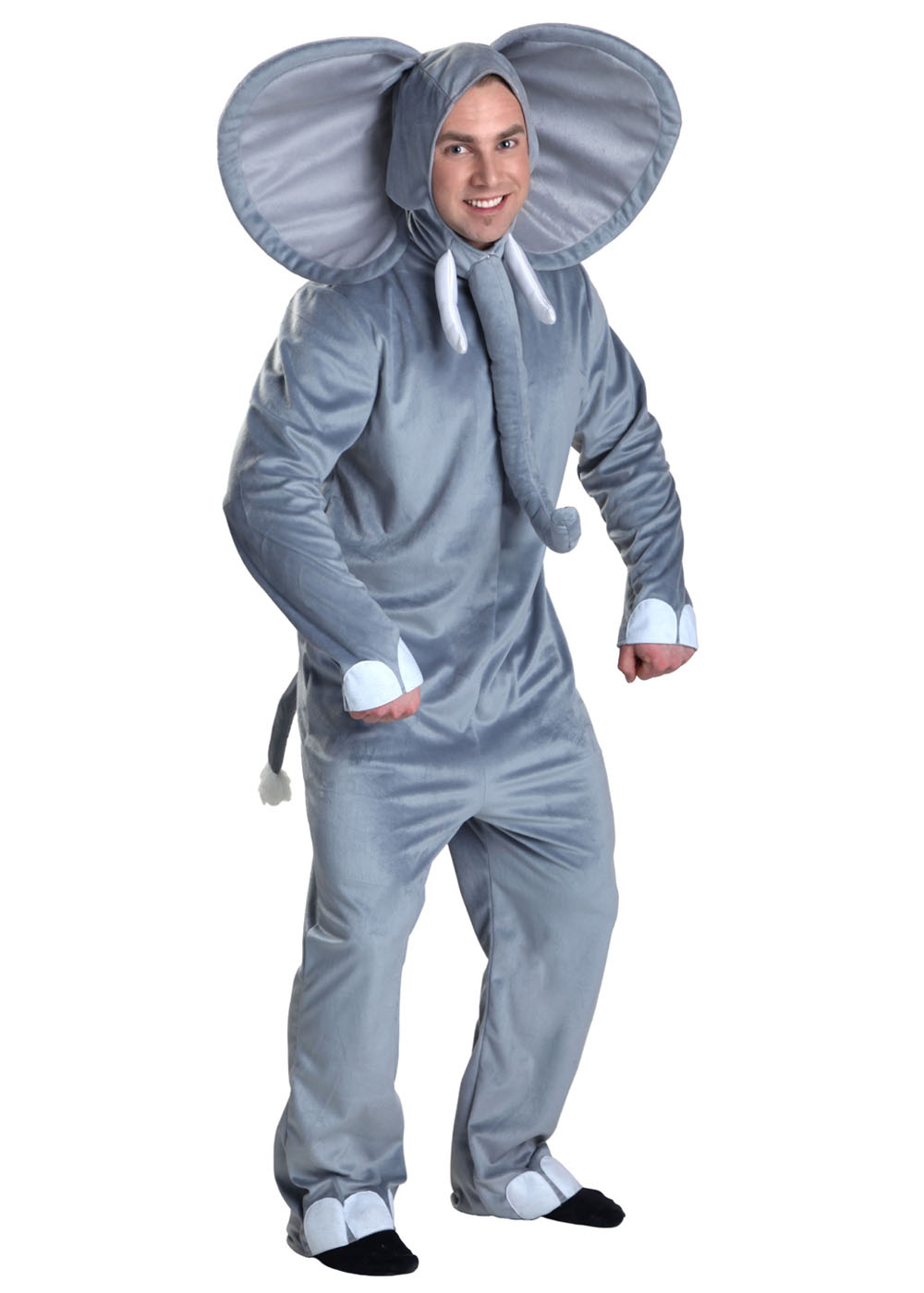 Костюм взрослого слона изготовлен из мягкого велюра. Комбинезон закрывается на липучках для удобства. На манжетах брюк и рукавов пришиты фетровые "когти". Хвост с искусственным мехом пришит на спину костюма. Голова с хоботом, бивнями и ушами.