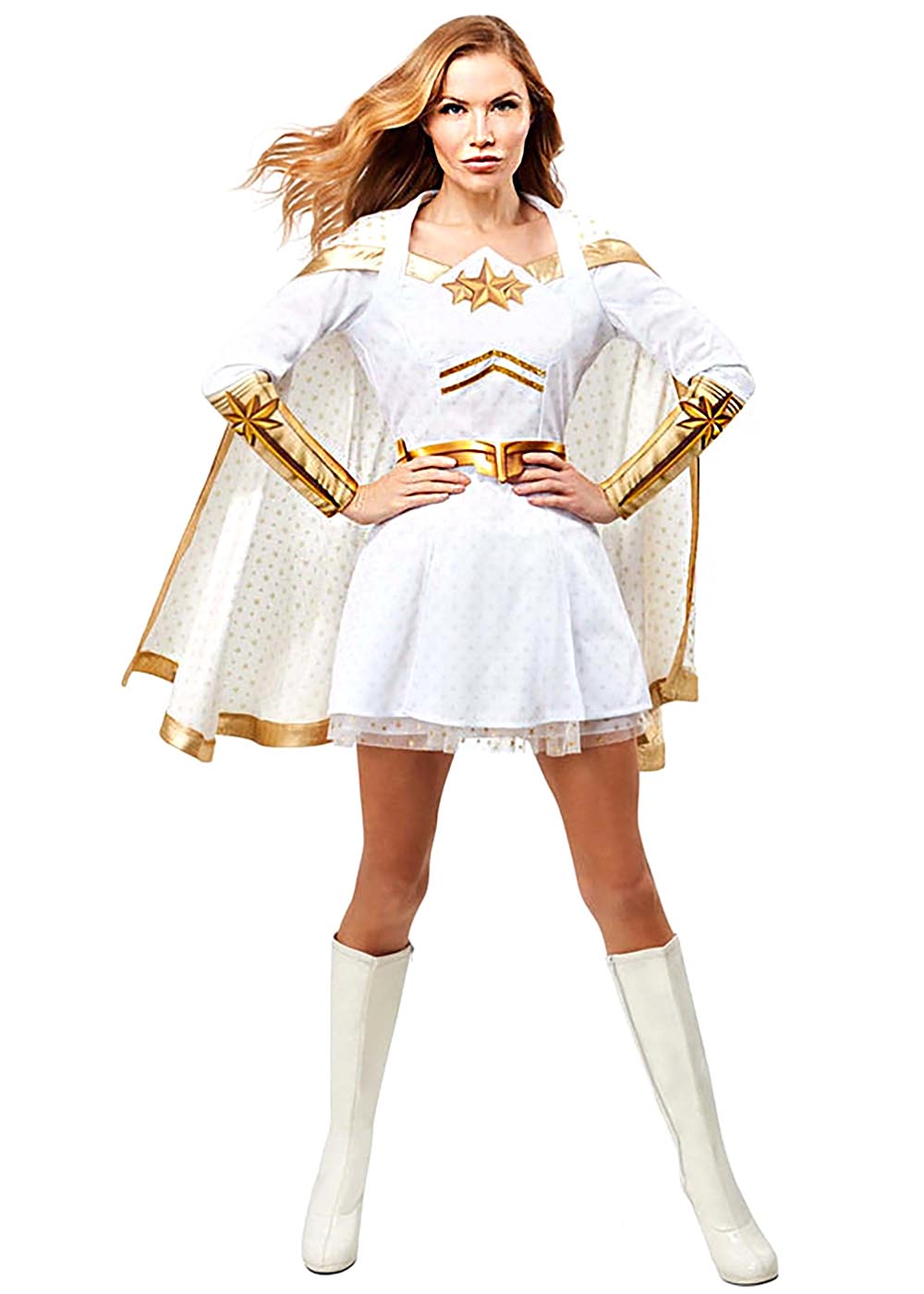 Костюм Старлайт воплощает в себе великолепие и элегантность. Белое платье с прикрепленной белой накидкой и золотыми вставками создает изысканный образ, притягивающий взгляды. Золотой пояс подчеркивает талию, придавая фигуре изящество и роскошь. Наряд не только отражает изысканный вкус, но и придает носительнице светящуюся уверенность, словно она явилась из самых ярких звездных сияний.