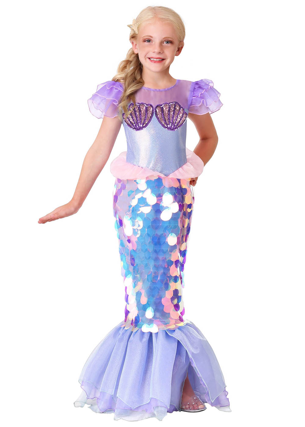 Этот костюм сверкающей русалки заставит вашу маленькую принцессу почувствовать себя настоящей морской сказкой! Липучка на спине обеспечивает легкость надевания. Костюм украшен большими пайетками, имитирующими чешуйки, а органза, прикрепленная внизу платья, добавляет легкости и изысканности образу.