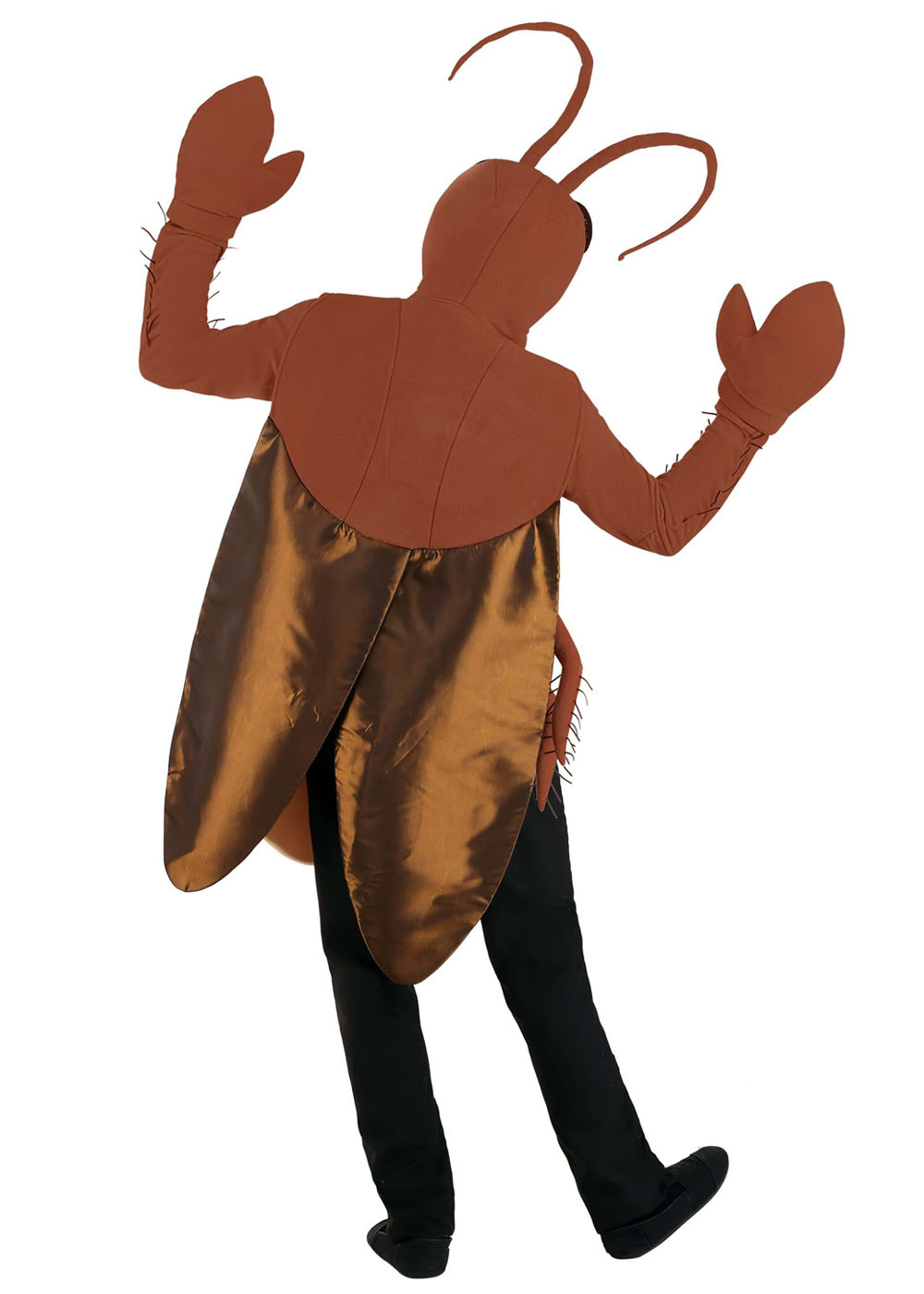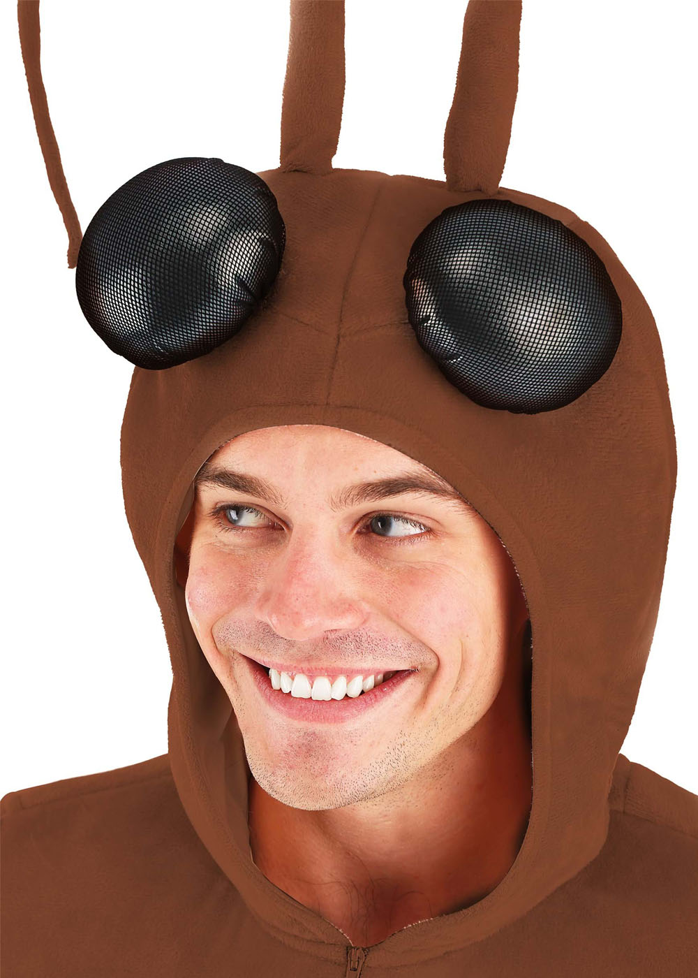 Взрослый костюм таракана включает кофту из мягкой ткани с прикрепленными пенопластовыми мини-шипами на ногах, капюшон с черными глазами и застежкой-молнией по центру спереди, а также рукавицы из мягкой ткани.