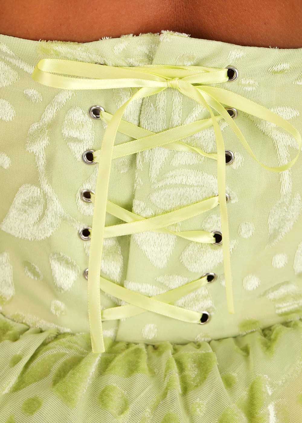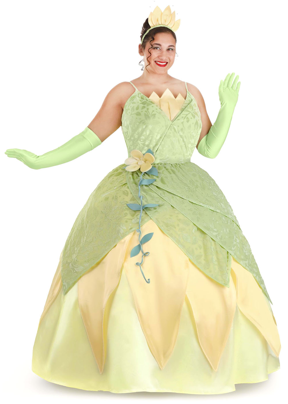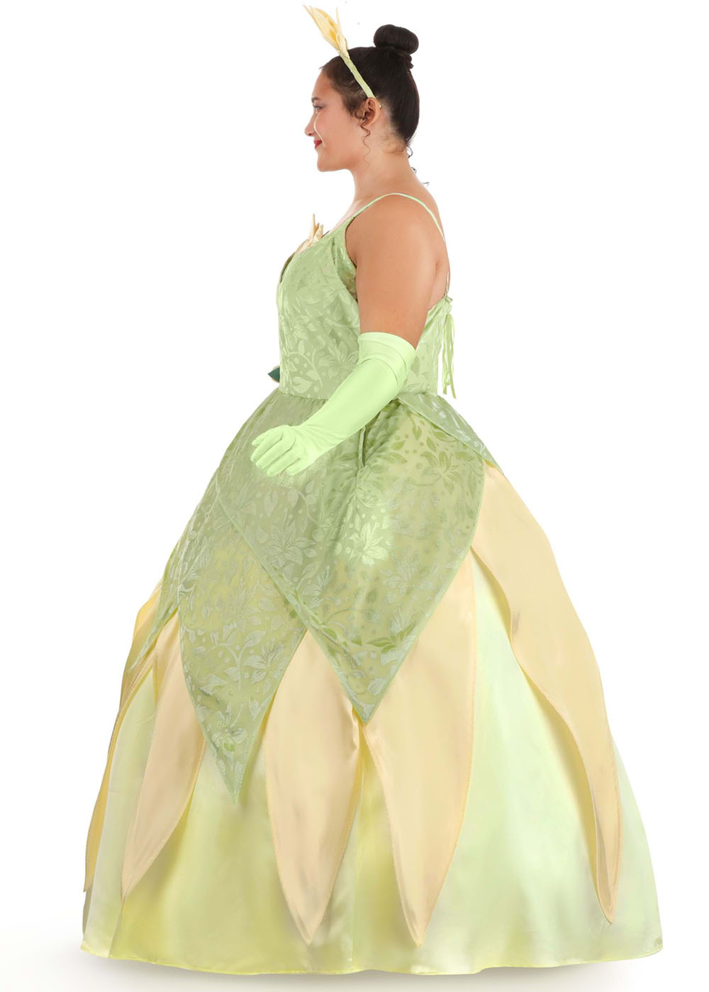 Костюм Тианы включает платье с молнией по центру спины. Верхний слой платья выполнен из бархата с узорами лепестков, а подкладка - из желтого атласа. В платье также встроенный каркас для создания объема. В комплект входят длинные зеленые перчатки и ободок с атласными лепестками и жемчужными стеблями.