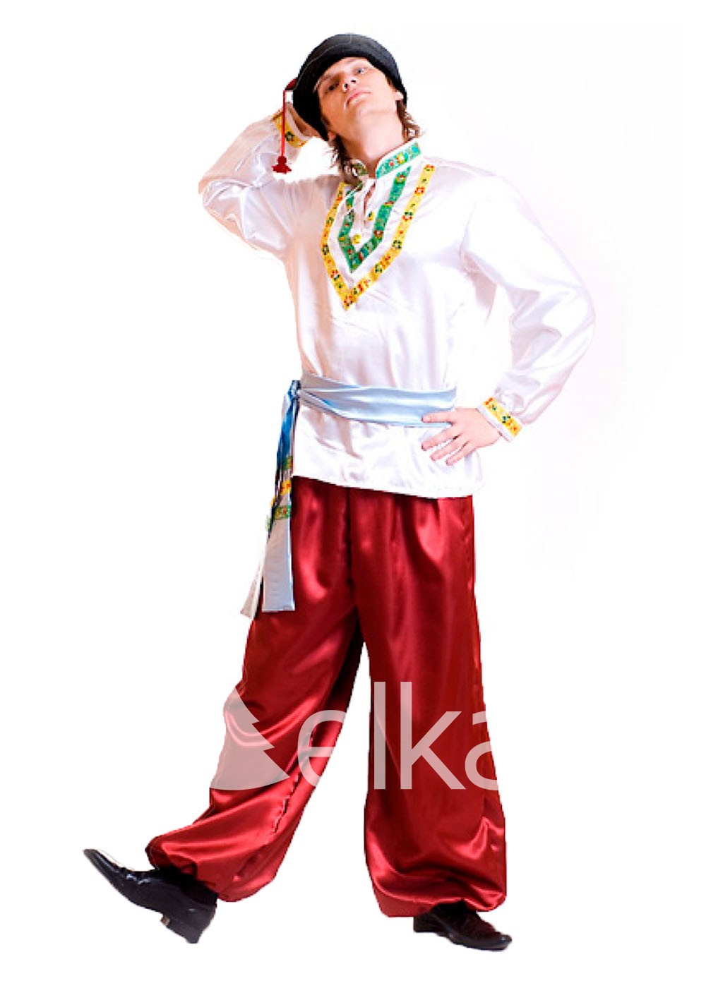 Наряд выполнен из атласа высокого качества в красно - белых тонах. Комплект составлен из сорочки, шаровар, кушака и шапки. Нарядная сорочка свободного кроя, длинными рукавами и воротником - стойкой украшена национальным орнаментом жёлтого и зелёного цветов. Кушак голубого цвета также украшен красочной тесьмой. Яркие широкие шаровары собраны резинкой на щиколотке. Шапка свободно и надежно будет держаться на голове при активностях.