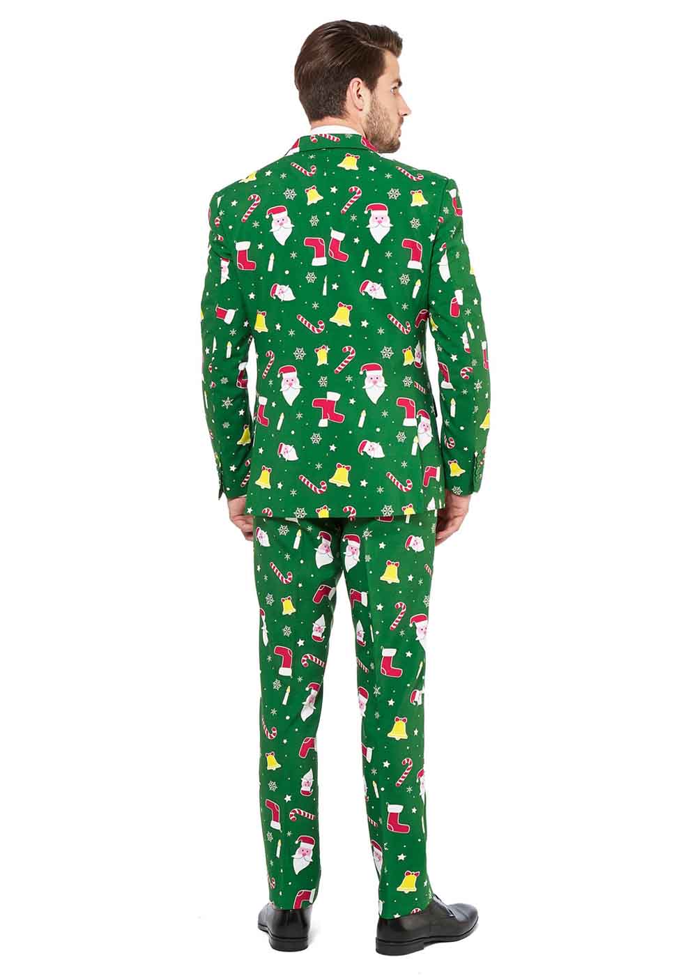 Пиджак костюма на подкладке. Застежка на пиджаке состоит из 2 пуговиц. Галстук соответствует костюму, галстук на завязках. Штаны застегиваются на пуговицу и крючок над молнией. Штаны специально длинные для носки с повседневной обувью.