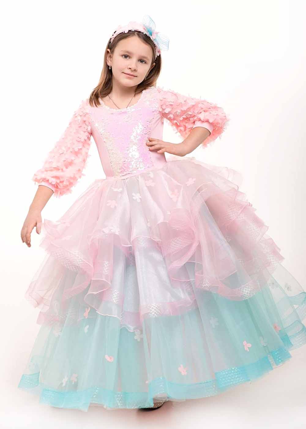 Костюм Весны для девочки включает платье, головной убор и кринолин. Верхняя часть платья выполнена из трикотажа и пайеточной ткани, что придает ему яркости и блеска. Объемные рукава украшены нежными цветами, создавая романтический образ. Юбка, благодаря многослойному фатину и подъюбнику, держит форму и придает наряду воздушности. Головной убор гармонично дополняет костюм, завершив образ весенней красавицы.