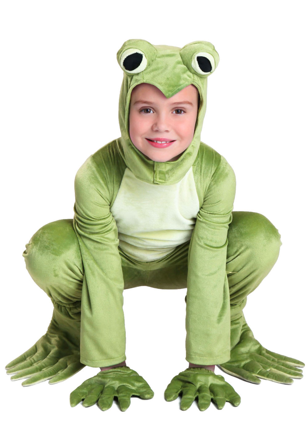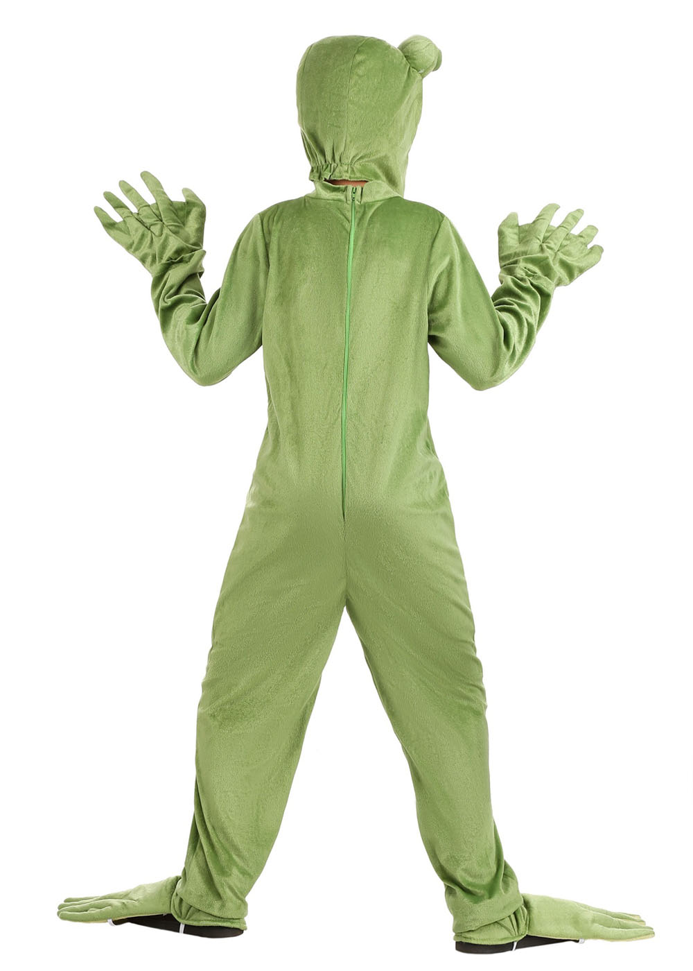 Костюм зеленой жабы выполнен из велюровой ткани с атласной подкладкой. Комбинезон с накладным животиком застегивается на липучку по центру спины. Костюм также включает перчатки с эластичными манжетами на запястьях. Мягкие накладки на обувь в виде лапок с эластичными лентами для крепления. Цвета могут отличаться от изображения.