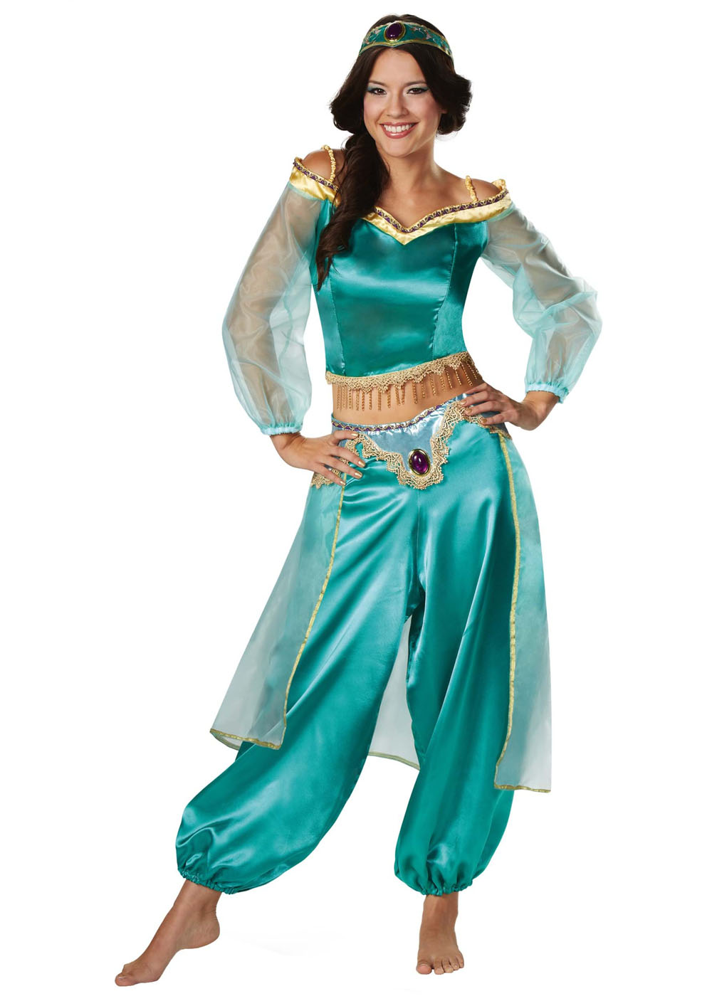Этот восхитительный костюм Жасмин для девушек создает образ изысканной принцессы Аграбы! Топ из атласа с открытой серединой, дополненный прозрачными рукавами и узкими эластичными бретельками, придаст образу благородства. Брюки с эластичной лентой на спине и манжетами с прозрачным наложением создают впечатление легкости и грации. Обтягивающая повязка на голову с застежкой на липучке и драгоценным камнем впереди завершает образ прекрасной принцессы.