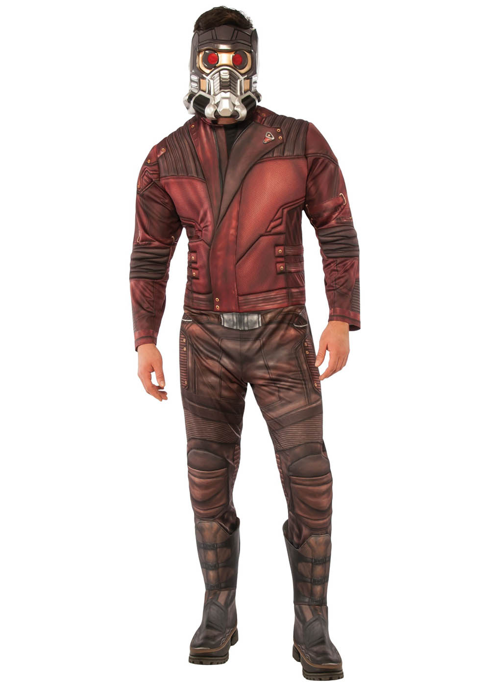 Костюм "Звездного лорда" включает комбинезон с принтом и застежкой на липучке на спине. На комбинезоне также имеются накладки на грудь, плечи, локти и колени для дополнительного объема. Накладки на ботинках имеют подкладку и эластичные ленты для крепления под обувью. Маска выполнена из твердого литого пластика с эластичной лентой для крепления вокруг головы.