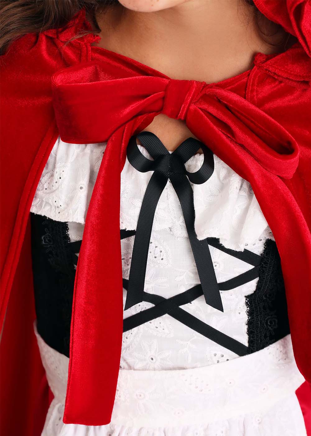 Традиционный костюм Красной Шапочки перенесет вас в мир сказок и загадок! Платье выполнено в стиле жилетки, юбки и передника поверх белой блузки. Белая блузка с эластичными манжетами на шее и рукавах. Черный жилет из бархата с задней молнией и ленточным шнурованием по центру. Белая отделка из кружева на красной юбке. Длинный плащ с капюшоном застегивается с помощью петель на шее.