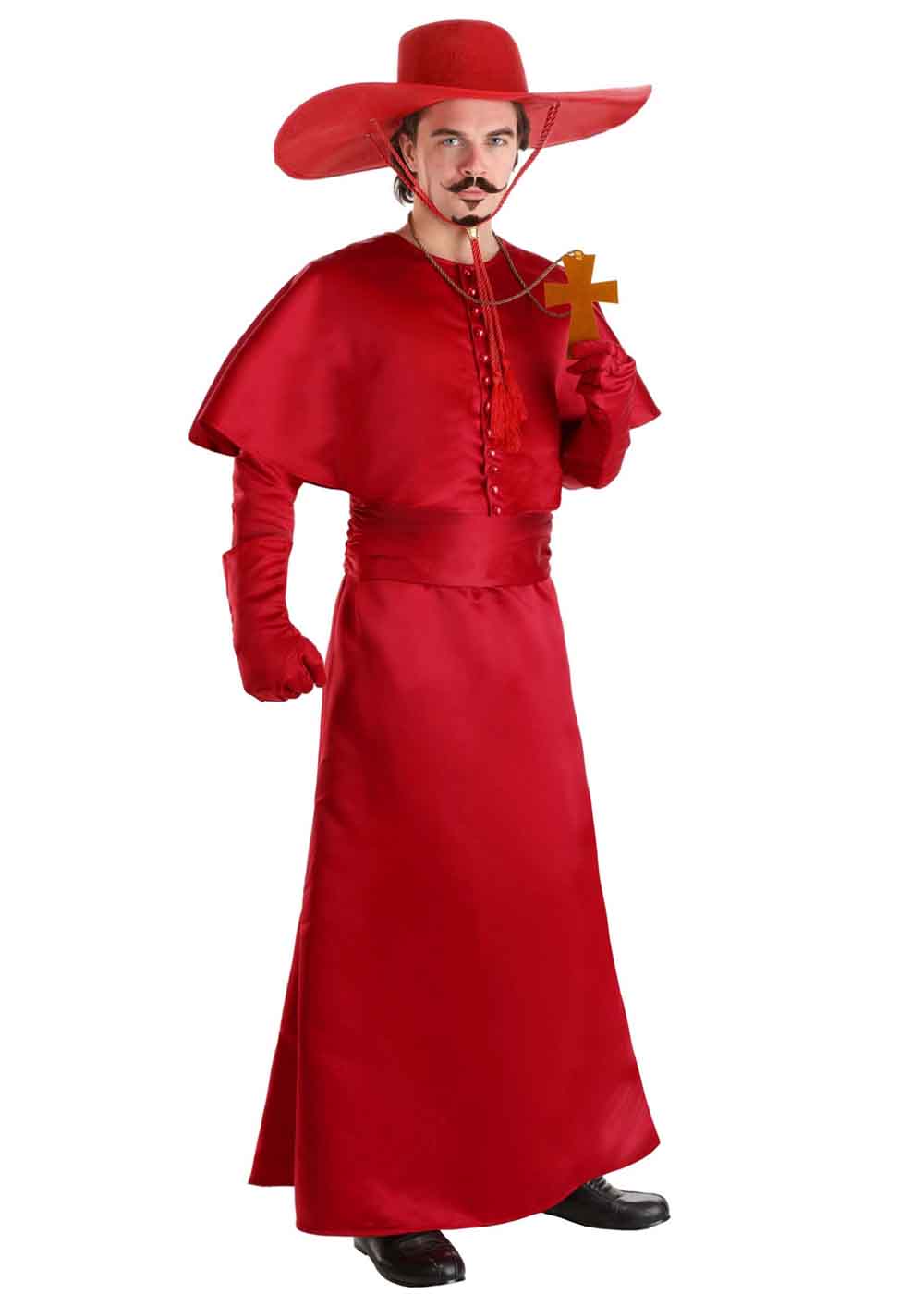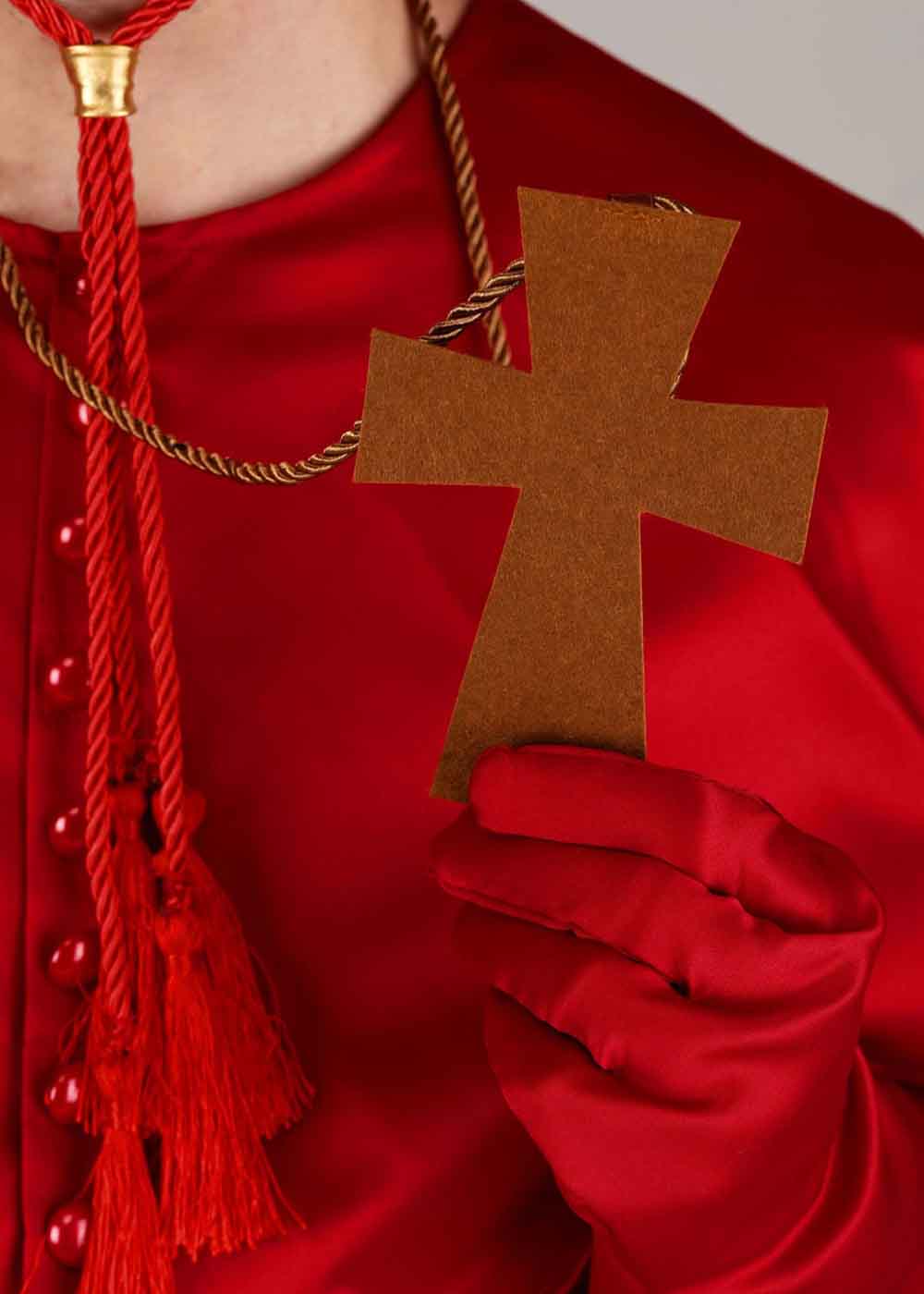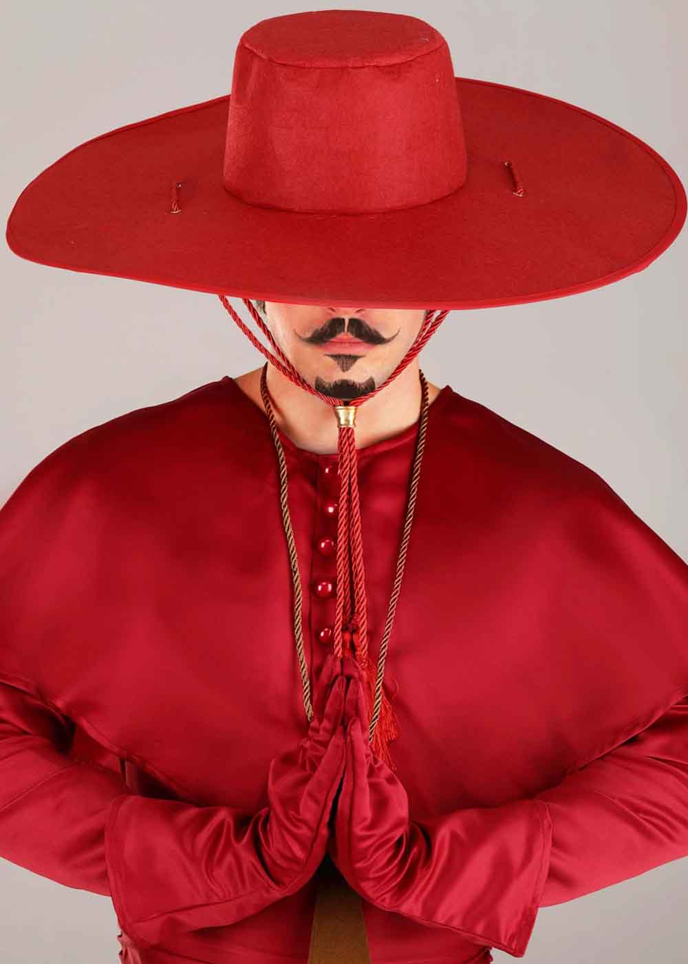 Красный костюм Инквизитора представляет собой стильный и загадочный наряд. Халат застегивается на крючки на шее сзади. Накидка украшена декоративными пластиковыми пуговицами. Пояс завязывается на талии с помощью липучек. Красные перчатки добавляют завершенности образу. Витой бронзовый шнур с крестом из коричневого фетра украшает костюм. Шляпу можно регулировать для удобной посадки.