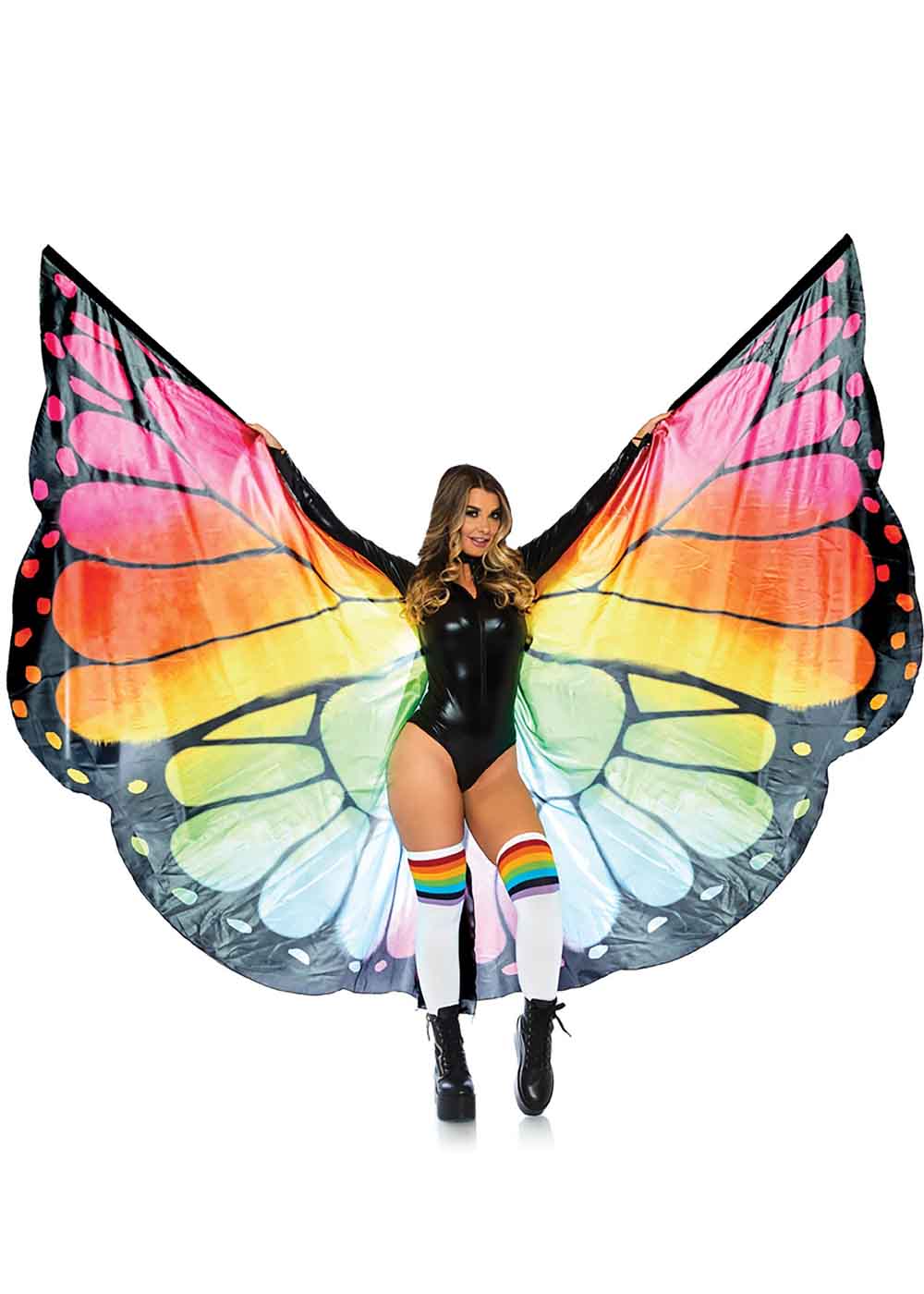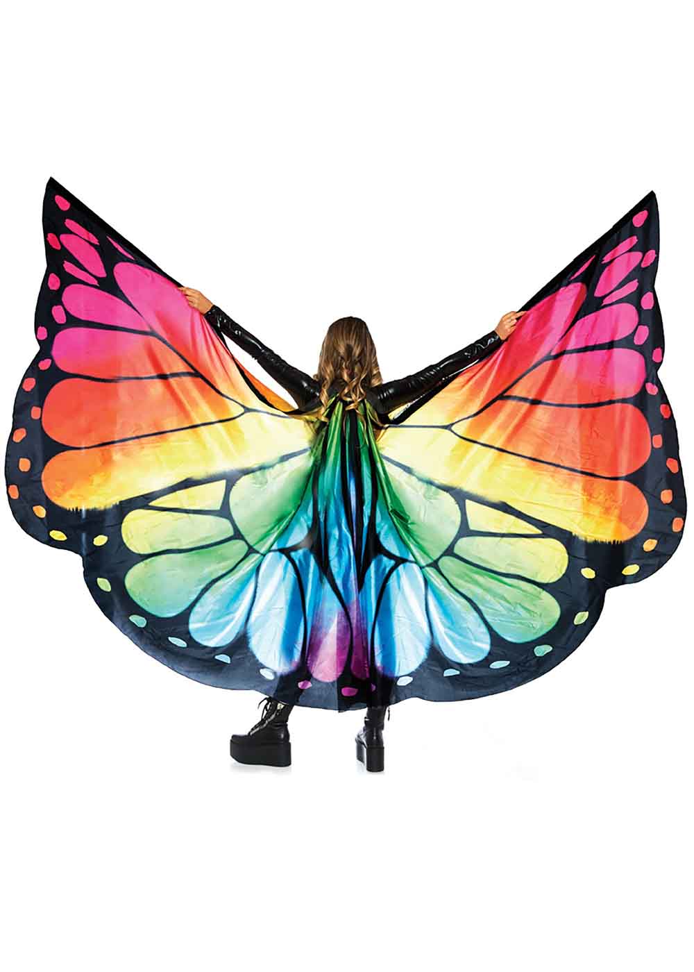 Радужные крылья бабочки, это волшебное дополнение к вашему образу. Изготовленные из полиэстера, они прекрасно дополнят ваш наряд. Накидка имеет удобную застежку-липучку на тканевой ленте, что обеспечивает легкость ношения и комфорт. Пластиковые стержни, вставленные в карманы по верхнему краю накидки, поддерживают ее форму и создают эффект мягкого плавания за вашей спиной. Длина накидки составляет 127 см, что позволяет создать эффектные образы. Узор на спине накидки изображает замысловатые крылья бабочки в радужных оттенках омбре, что придает вашему облику неповторимый шарм и загадочность.