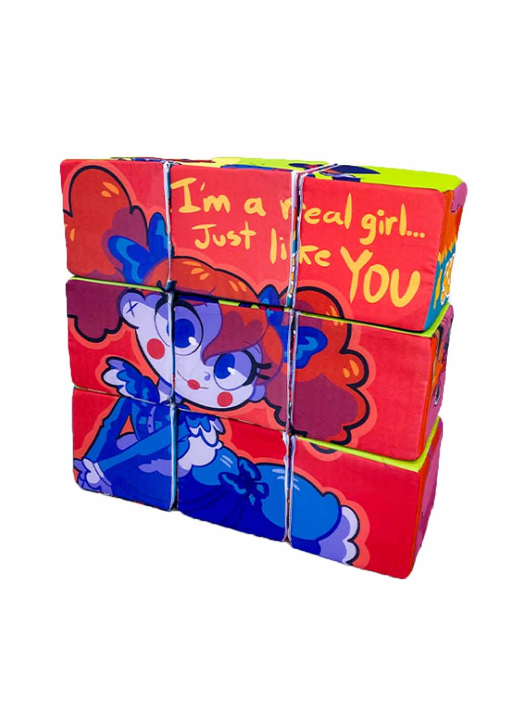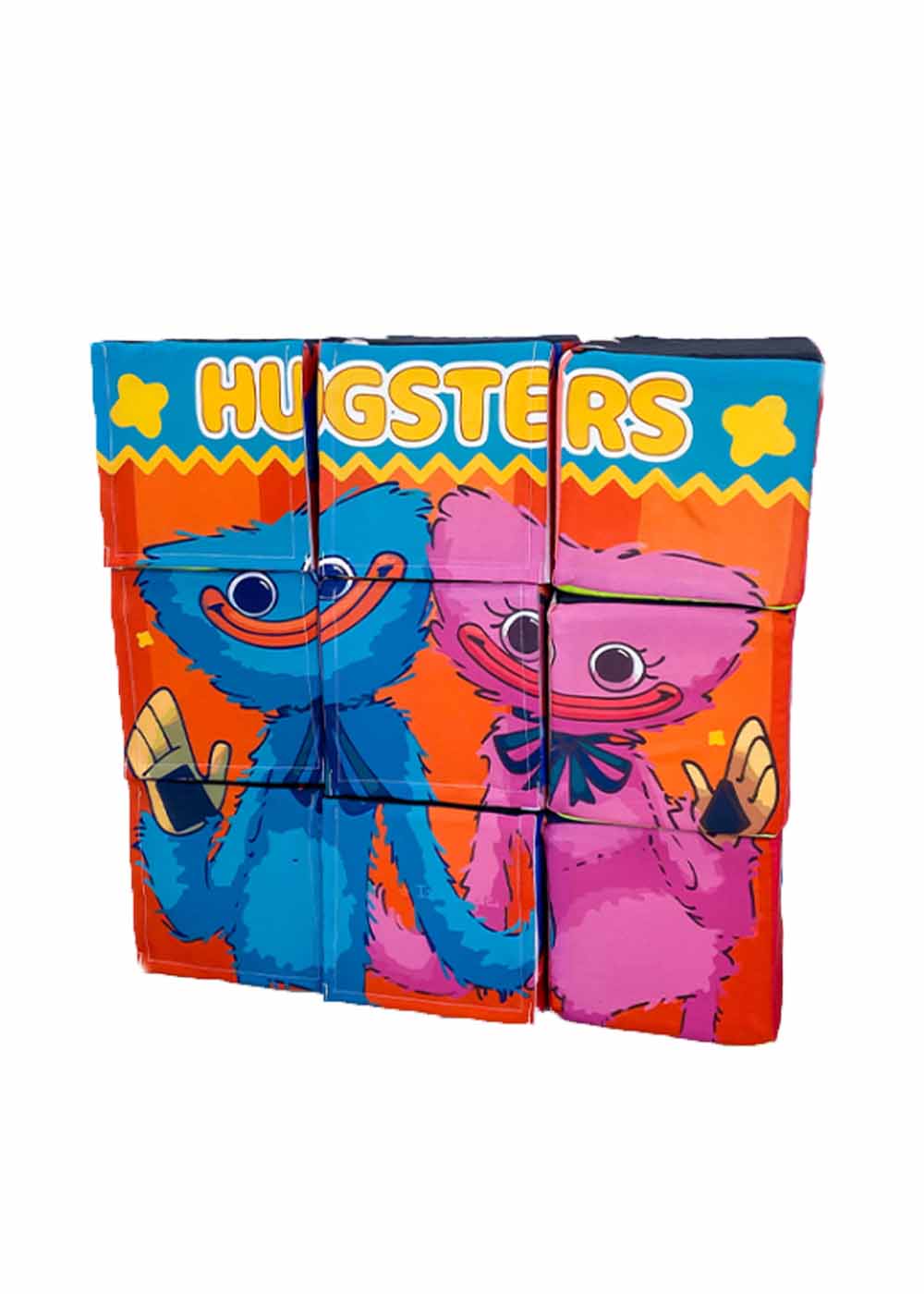 Реквизит Кубики пазлы Хагги Вагги представляет собой набор из 9 поролоновых кубиков. Каждый кубик имеет съемный чехол с яркими изображениями, связанными с персонажами Хагги Вагги.