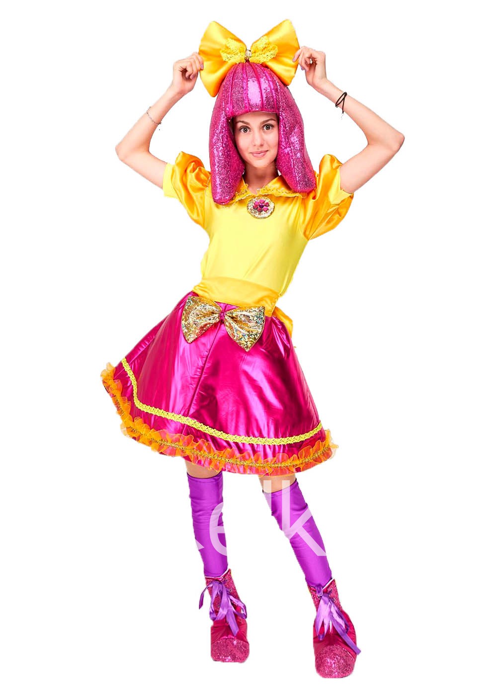 Костюм Кукла ЛОЛ Королева Блеска выполнен из высококачественных материалов. В традиционной расцветке. Костюм разработан по мотивам серии игрушек "LOL Surprise". В комплект входит: кофта, юбка, головной убор, гетры, обувь. Карнавальный костюм Кукла LOL Glitter Queen станет яркой героиней Вашего праздника. Восторженные глаза взрослых и детей, улыбки, объятия, и бесконечные красочные фотографии Вам обеспечены.