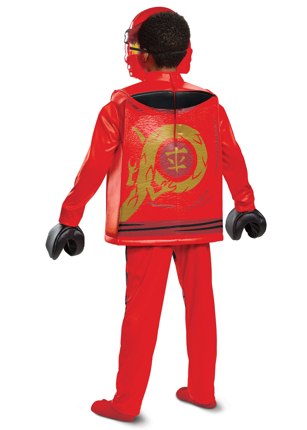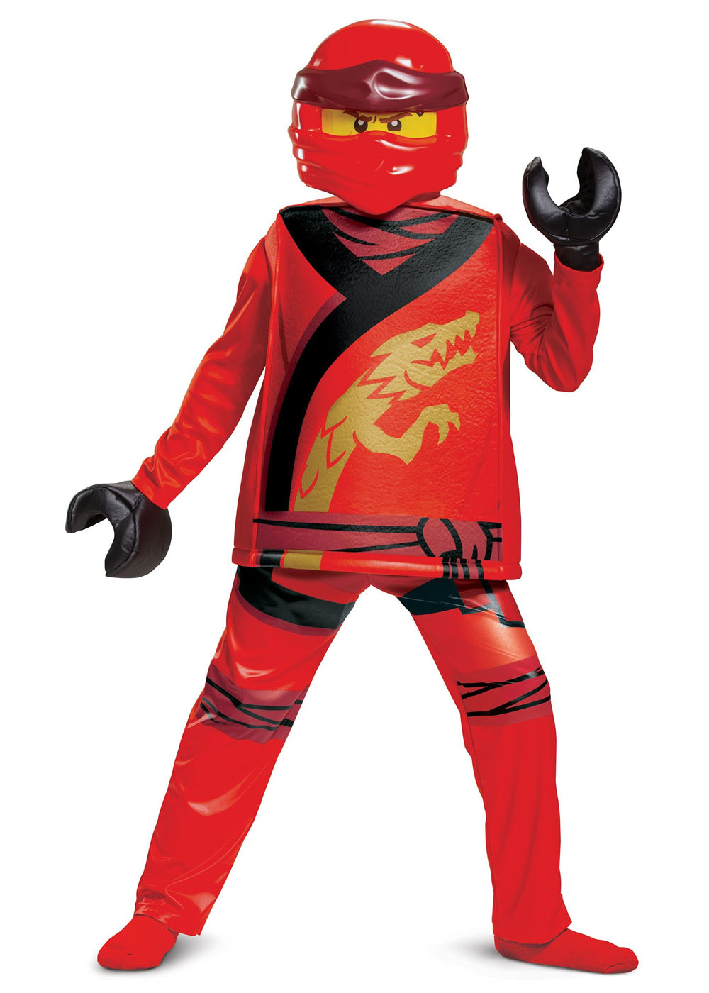 Красный костюм Ниндзяго включает в себя кофту, штаны и маску. Кофта имеет квадратную форму и застегивается на липучку на спине. Она с подкладкой спереди и сзади, а рукава и боковые панели выполнены из ткани. Брюки с эластичным поясом. Маска покрывает всё лицо, имеет эластичную ленту для крепления и сетчатое окно для видения.