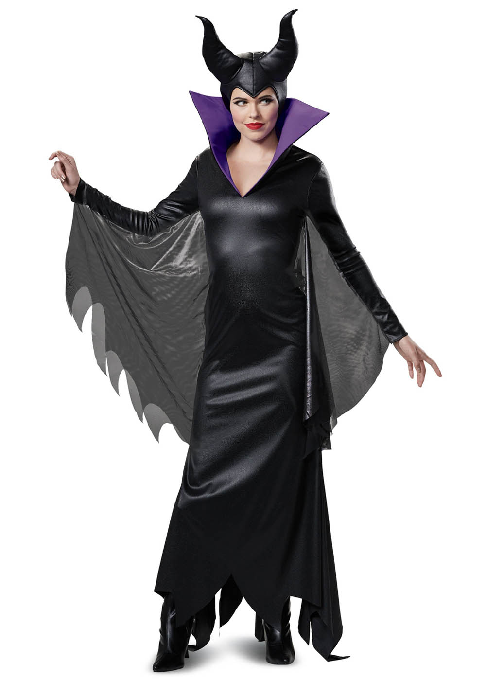 Костюм Малифисенты изготовлен из полиэстера черного и фиолетового цветов, а также наполнителя из полиэстера и спандекса. Основа головного убора выполнена из полиуретановой пены, а рога наполнены мягким материалом. Платье застегивается на липучки на спине. Сетчатые вставки под рукавами пришиты к бокам платья. У головного убора эластичный край для плотной посадки.