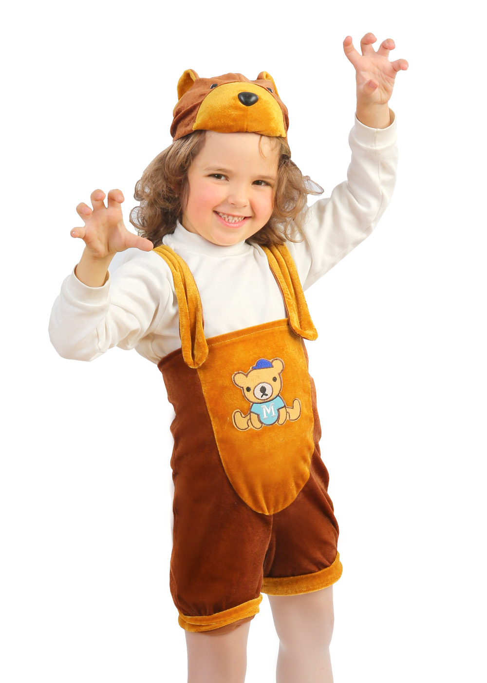Детский костюм Мишки пошит из высококачественных материалов. Комплектация состоит из: комбинезона и шапки-маски. Основной цвет - коричневый. Велюровый костюм коричневого цвета с светлой вставкой на груди и манжетах. Присутствует иллюстрация мишки. Головной убор - шапка-маска с пластиковыми глазами и носом, а также ушками, что завершает образ.