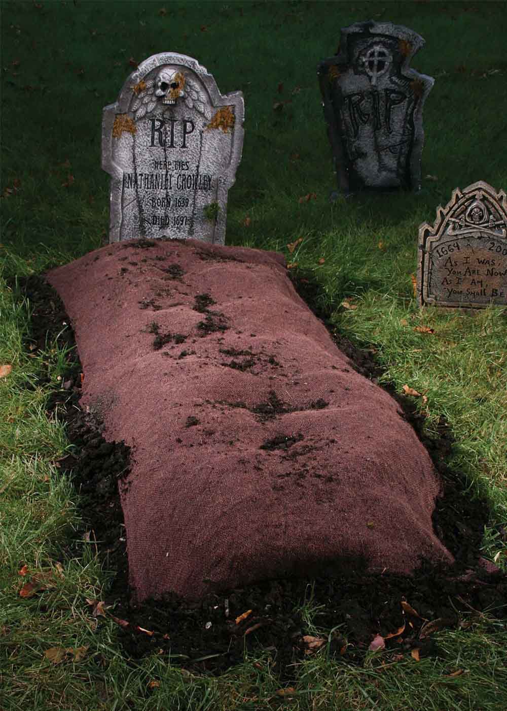 Могила - реалистичное украшение для Хэллоуина, которое добавит загадочности вашему декору. Размеры составляют 152 см в длину и 122 см в ширину. Одеяло из мешковины размером 61 х 152 см прикрывает могильный курган. Металлические колья с крючками сверху используются для фиксации одеяла.