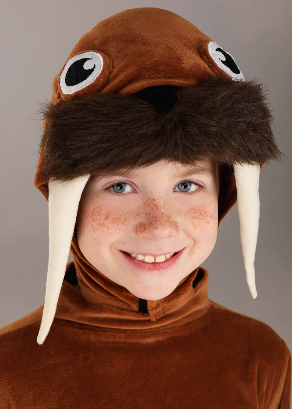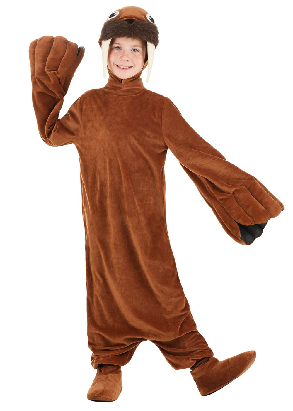 Морж костюм прекрасно передает внешний вид морского обитателя. Комбинезон с молнией на спине легко надевать. Рукава с наполнителем, чтобы имитировать плавники, добавляя правдоподобности. Манжеты на щиколотках помогают костюму хорошо сидеть. Мягкий капюшон с вышитыми глазами, наполнителем для объема и клыками придает костюму особый морской вид. Капюшон также имеет длинные усы и застежку на липучке под подбородком. Накладки на ноги с резинками удобно фиксируются под обувью, завершая реалистичный образ моржа.