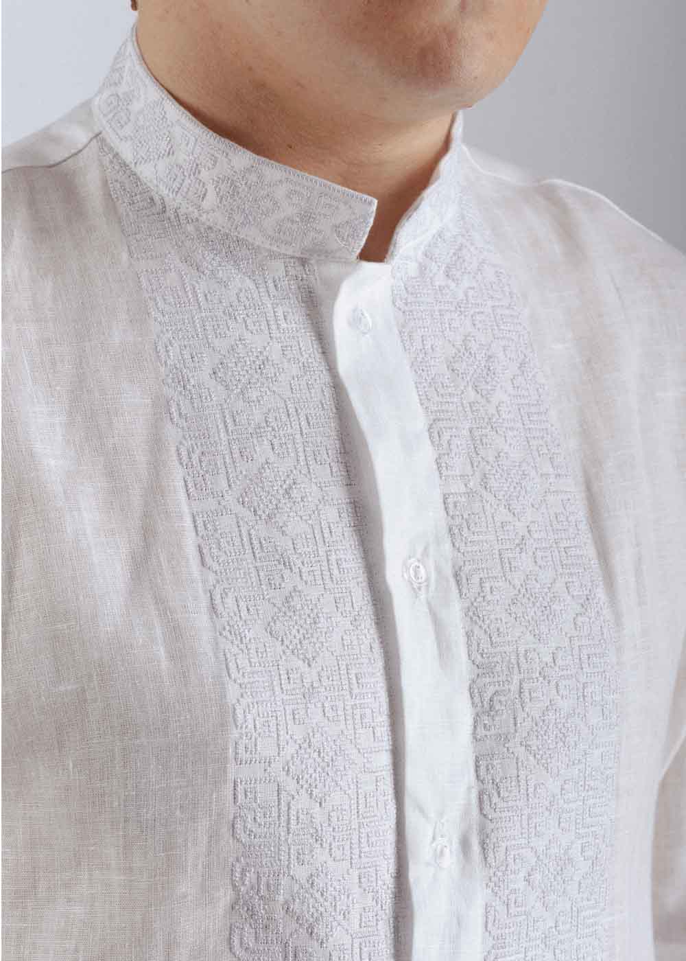 Мужская вышитая рубашка Бурштин представлена в белом цвете и выполнена из натурального льна. Предлагается во всех размерах. Вышиванка белым по белому прямого кроя с длинным рукавом, имеет воротник-стойку. Декорирована спереди и на воротнике аутентичной вышивкой.