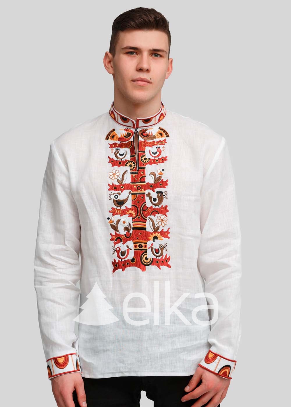 В вышивке сочетаются оттенки красного, черного, желтого и коричневого. Орнамент на сорочке вышит в технике "гладь", символизирует мужскую энергию и силу. Вышитая рубашка приятная к телу, имеет длинный рукав и воротник-стойку, за счет прямого силуэта комфортная и не сковывает движений.
